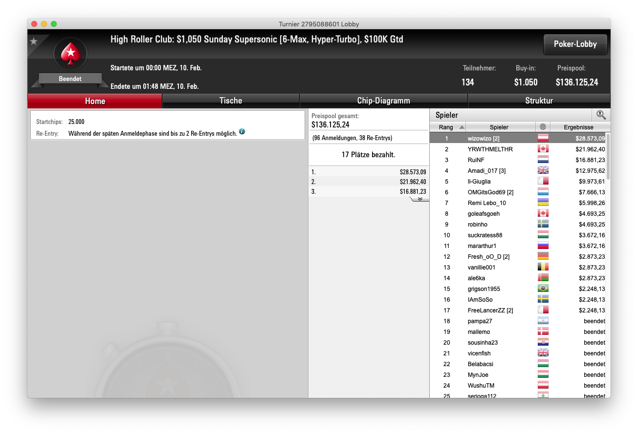 Auch am gestrigen Sonntag konnter er auf PokerStars mit Oliver Kahn-Avatar wieder gewinnen. Er triumphierte beim Sunday Supersonic. 96 Spieler wagten sich für $1.050 an das Turnier und produzierten insgesamt 134 Entries, womit ein Preispool von $136.125,24 feststand. 17 Plätze wurden bezahlt.