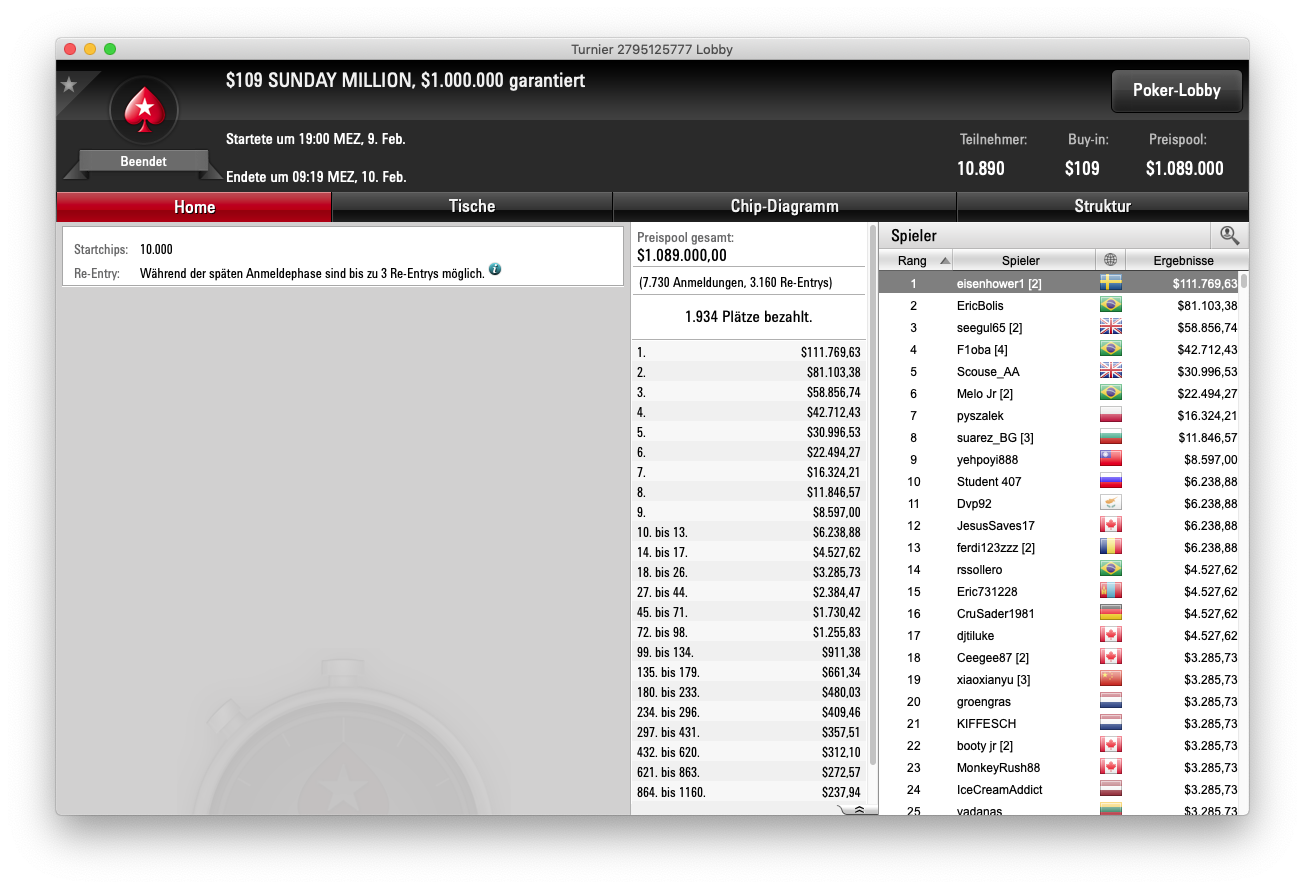 Das Sunday Million auf PokerStars ist wohl das wöchentliche Turniere im Online-Poker überhaupt. Für ein vergleichsweise schmales Buy-In von $109 gibt es $1.000.000 garantiert. Am gestrigen Sonntag kamen 7.730 Spieler zusammen, um insgesamt füt 10.890 Entries zu sorgen, womit der Preispool bei $1.089.000 lag.