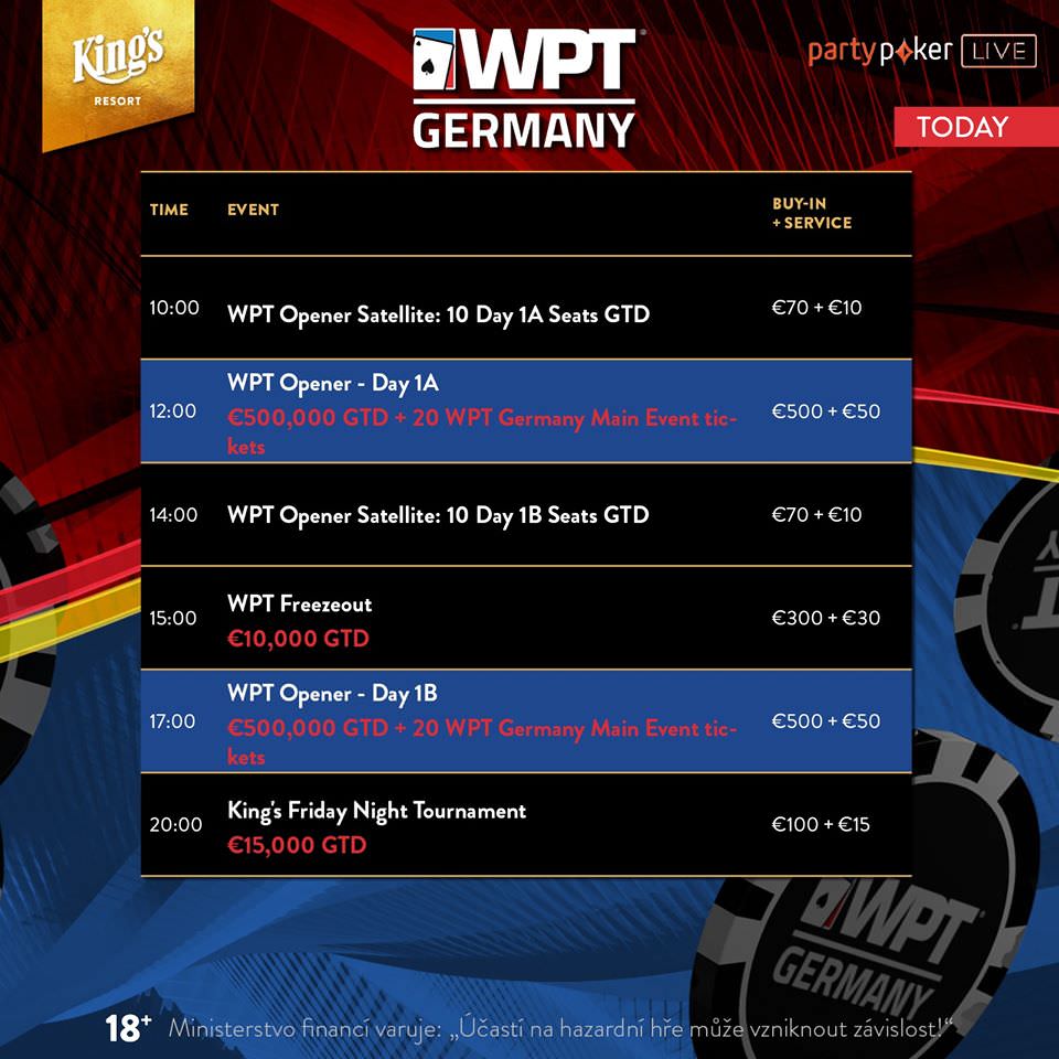 Der erste von insgesamt acht Starttagen Eins des €500+€50 World Poker Tour Germany Opener Events startet um 12:00 Uhr. Bei dem Turnier wird ein Preisgeld von €566.000 (inklusive 20 x €3.300 WPT Germany Main Event Tickets) garantiert. Die Startdotation beträgt 30.000 und die Blind-Zeiten betragen durchgehend 30 Minuten. Unlimited Re-Entries sind möglich und die Late-Registration ist an jedem Starttag Eins für acht Level geöffnet. Am Tag 1a wird so lange gespielt bis noch 15% der Entries im Turnier sind. Alle Spieler die sich für Tag 2 qualifizieren bekommen umgehend den Min-Cash von €1.000. Der Tag 2 findet am Montag ab 13:00 Uhr statt. Der Sieger wird erst im Finale am Dienstag ab 12:00 Uhr ermittelt. Ab Montagabend gibt es auch einen Livestream vom Turnier.