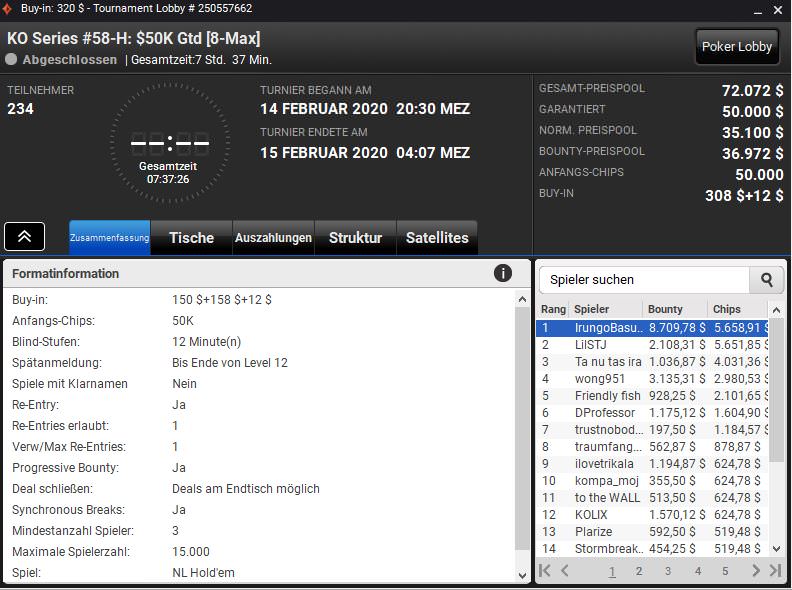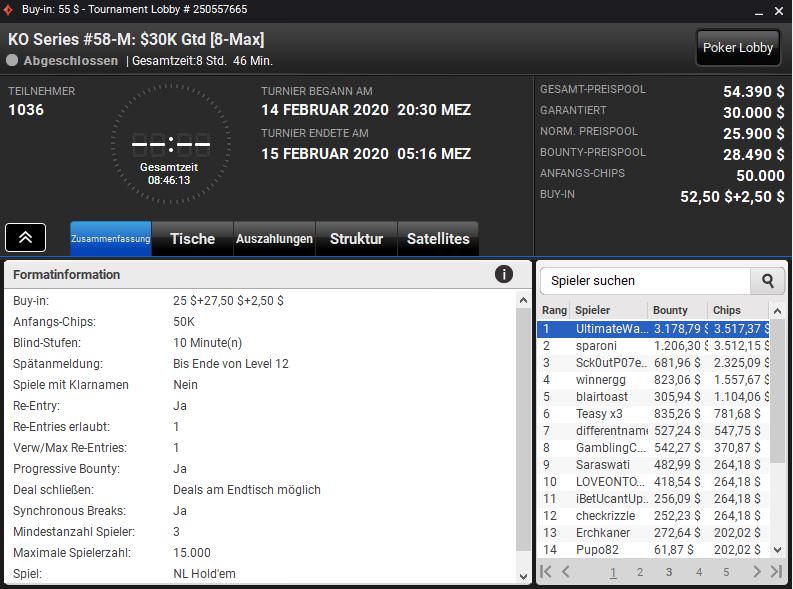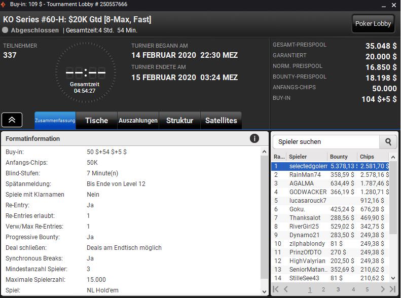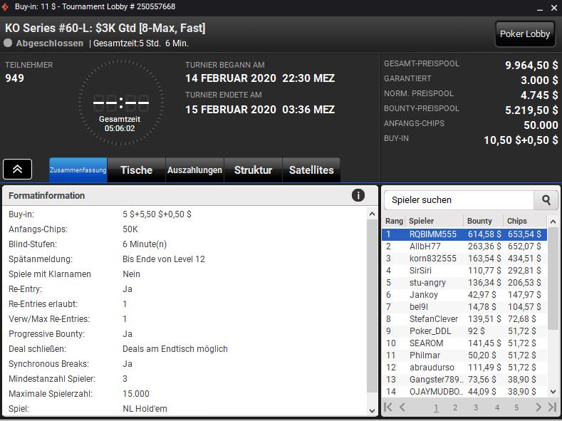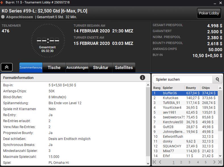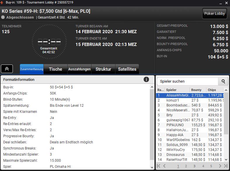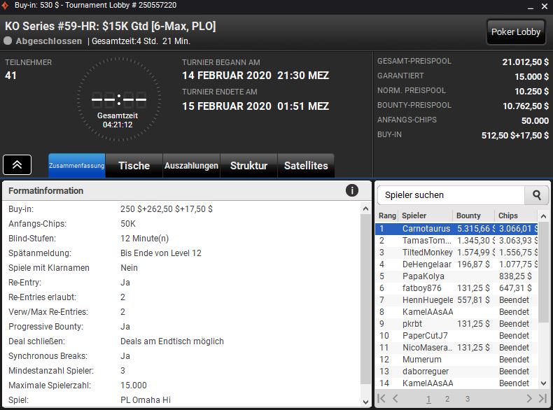 Neben NLHE wurde gestern auch PLO 6-Max gespielt. Die High Roller Ausgabe von Event 59 mit $530 Buy-in gewann Carnotaurus. Neben $3.066,01 Prämie sammelte er zusätzlich $5.315,66 an Bounties ein. Die $109-Augabe ging an AlissaWhiteGluz ($1.197,28/$2.723,63), das kleine $11 PLO 6-Max gewann bluffer36 ($374,24/$637,04).
