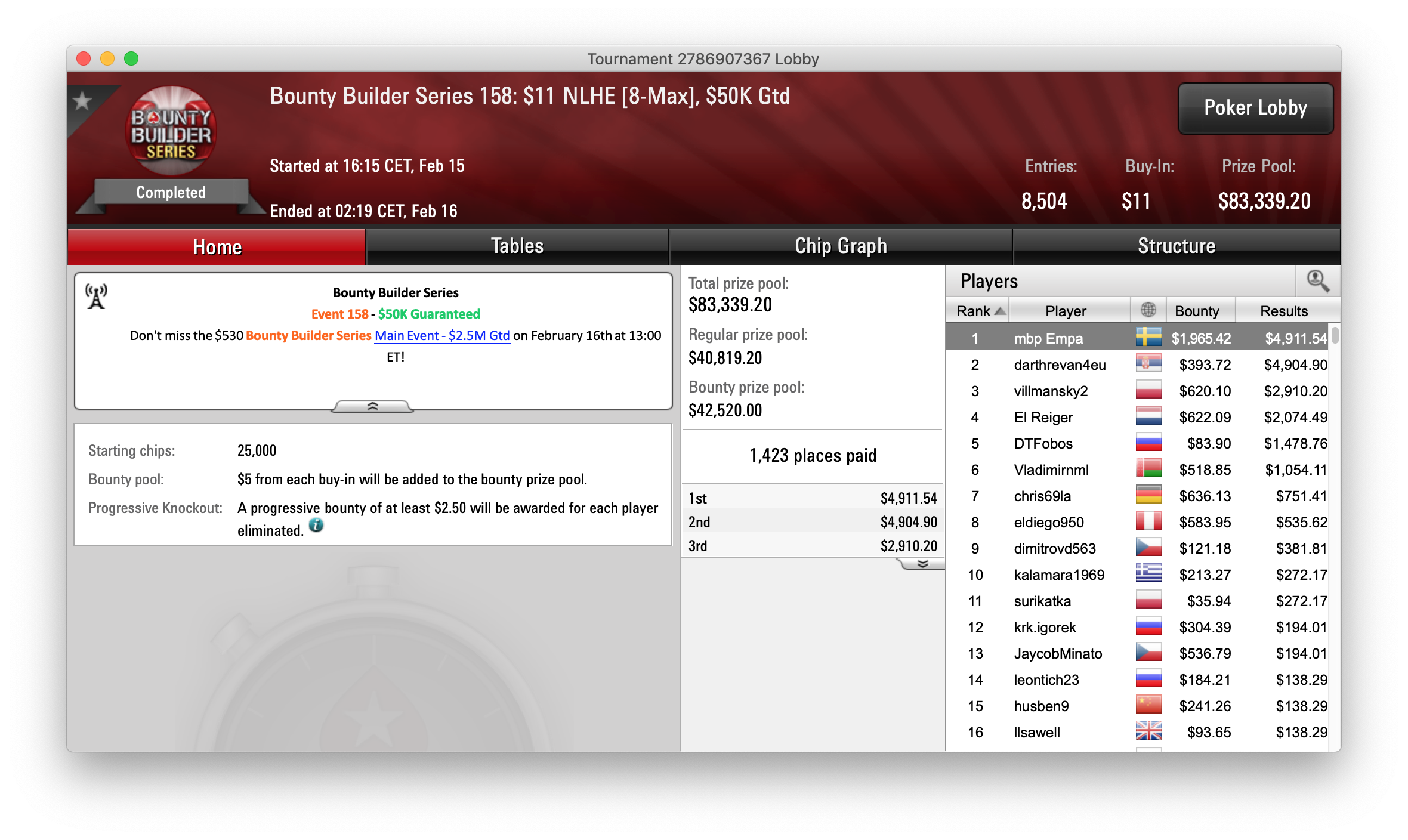Die PokerStars Bounty Builder Series ging gestern in die vorletzte Runde. Tausende Spieler stiegen wieder in den Ring bei den Events #157 bis #168, bei denen wieder alle Buy-In-Größen von $1,10 bis $2.100 zu finden waren.