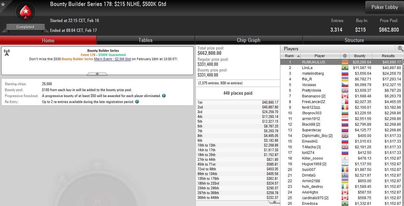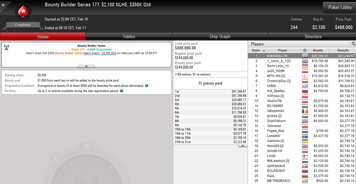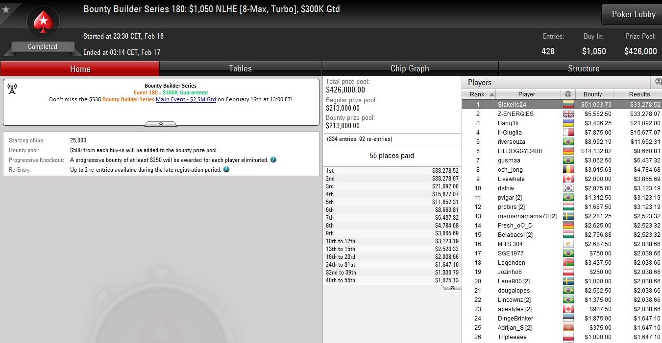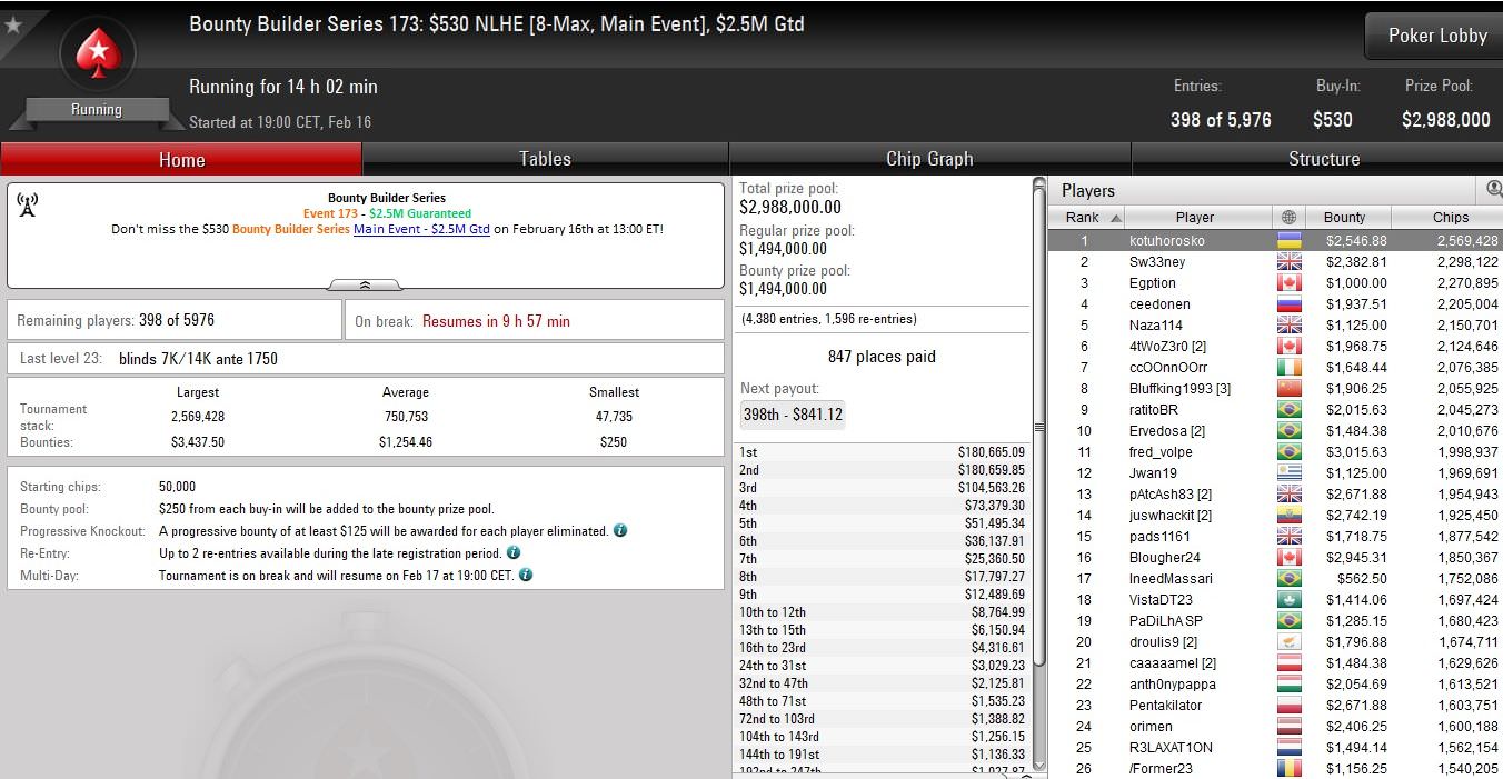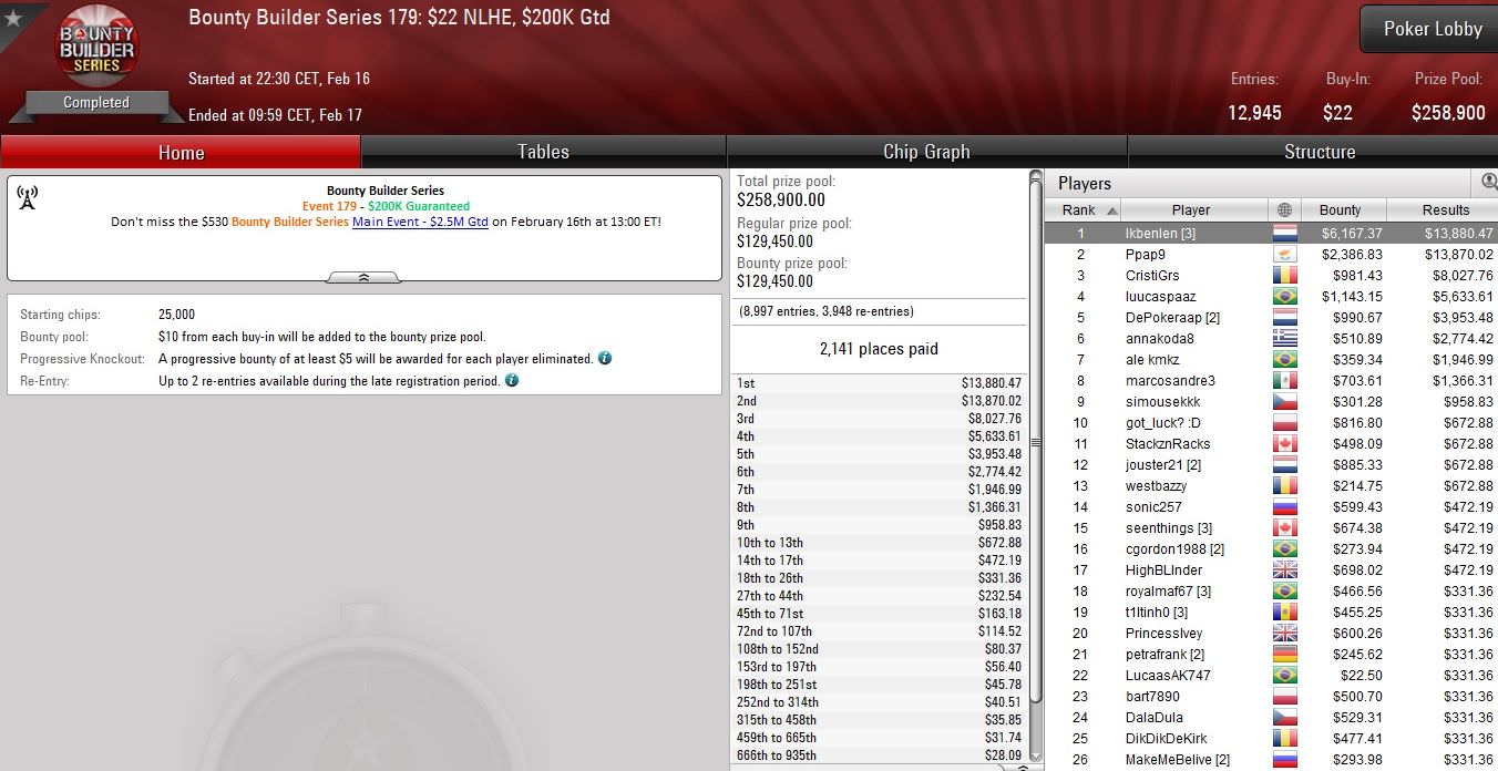 Noch einmal zwölf Turniere standen zum Abschluss der Bounty Builder Series auf PokerStars an.