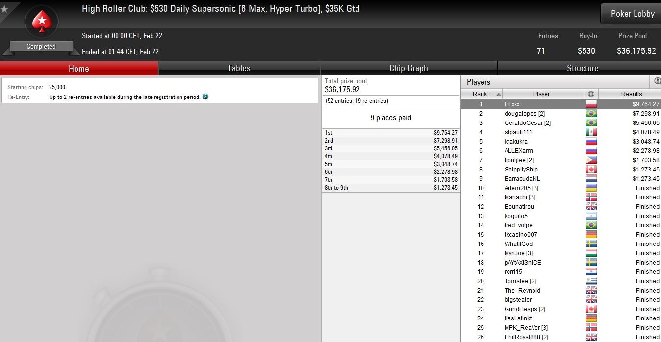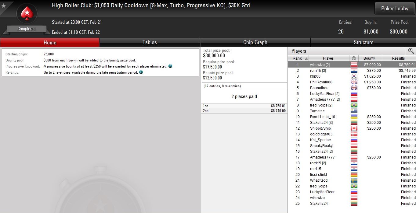 Größter Gewinner des Tages war aber der Schwede „WhatIfGod“, der sich beim $530 Bounty Builder schadlos hielt und über $26.000 Preisgeld einfuhr.