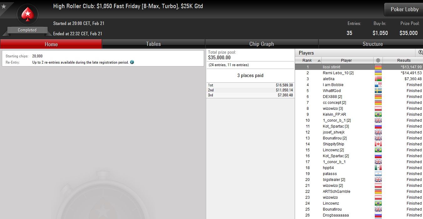 Beim exklusiven $1.050 Fast Friday im High Roller Club setzte sich Christopher „lissi stinkt“ Frank gegen 34 Konkurrenten durch und kassierte gut $13.000.