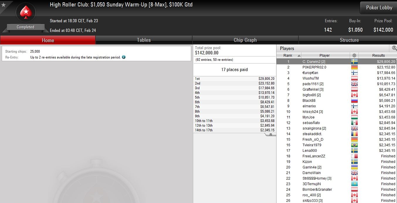 Dafür gab es knapp $25.000 Preisgeld – kein schlechter Stundenlohn für die zweistündige Action, und das nachdem derselbe Spieler schon beim HR Warm-Up hinter Simon „C. Darwin2“ Mattsson den zweiten Platz belegt hatte.