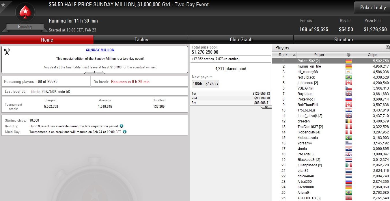 Während das Warm-Up mit dem Sieg des Rumänen „cataccc7“ (3-way Deal, $39.298,20) bereits gestern entschieden wurde, geht die Sunday Million in die Verlängerung.