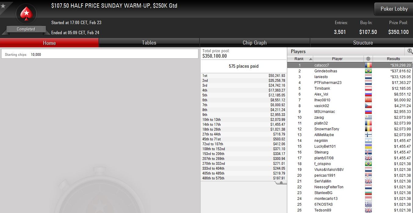 Am gestrigen Sonntag war auf PokerStars wieder einmal „Half Price Sunday“ angesagt, und die beiden Turnierflaggschiffe Warm-Up und Sunday Million lockten mit einem halbierten Startgeld von $107,50 bzw. $54,50.