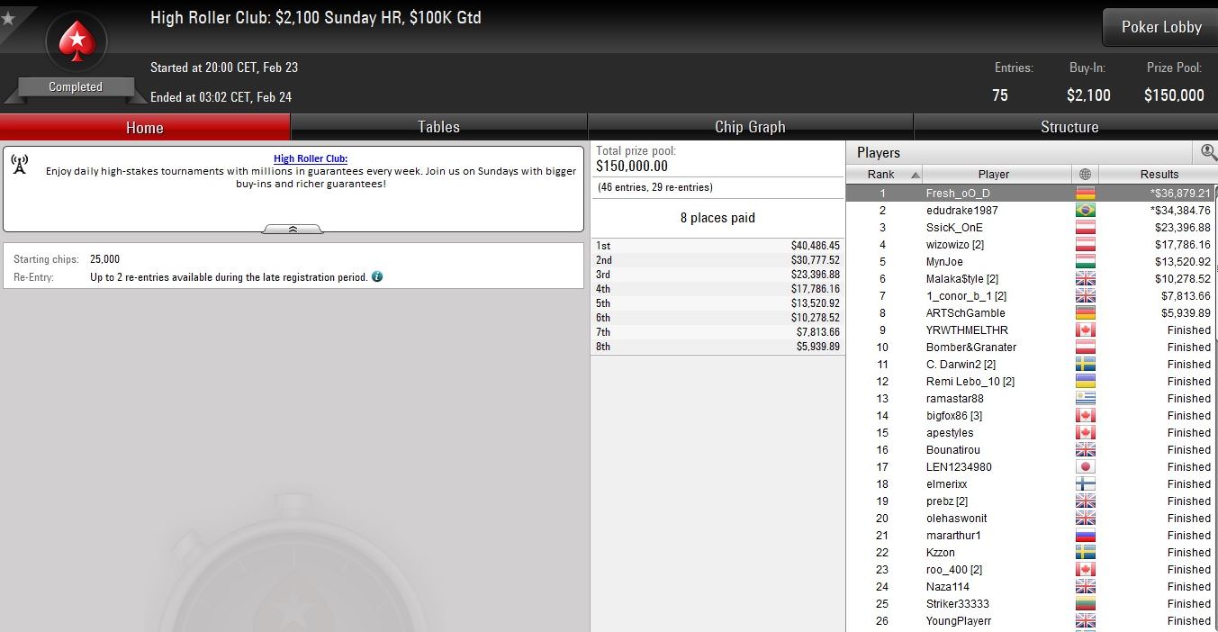 Bereits den Sieg unter Dach und Fach gebracht hat dagegen Jens „Fresh_oO_D“ Lakemeier beim $2.100 Sunday Highroller. Beim teuersten Turnier am Sonntag einigte er sich mit dem Brasilianer „edudrake1987“ auf einen Deal und kassierte knapp $37.000.