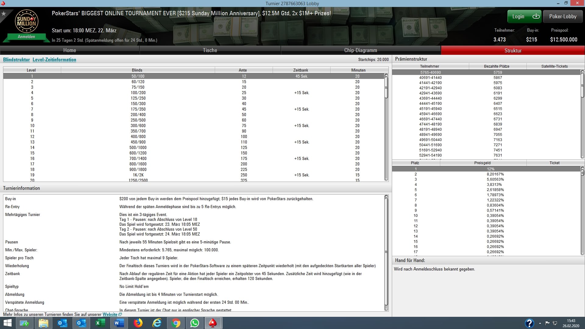 Am 22. März 2020 soll dieser Rekord nun gebrochen werden. Für ein Buy-In von $215 wird es mindestens um $12.500.000 gehen. Um die Garantie zu erreichen nötigt der Branchen-Primus satte 62.500 Starts. Die Plätze Eins und Zwei werden mindestens eine Million Dollar gewinnen.