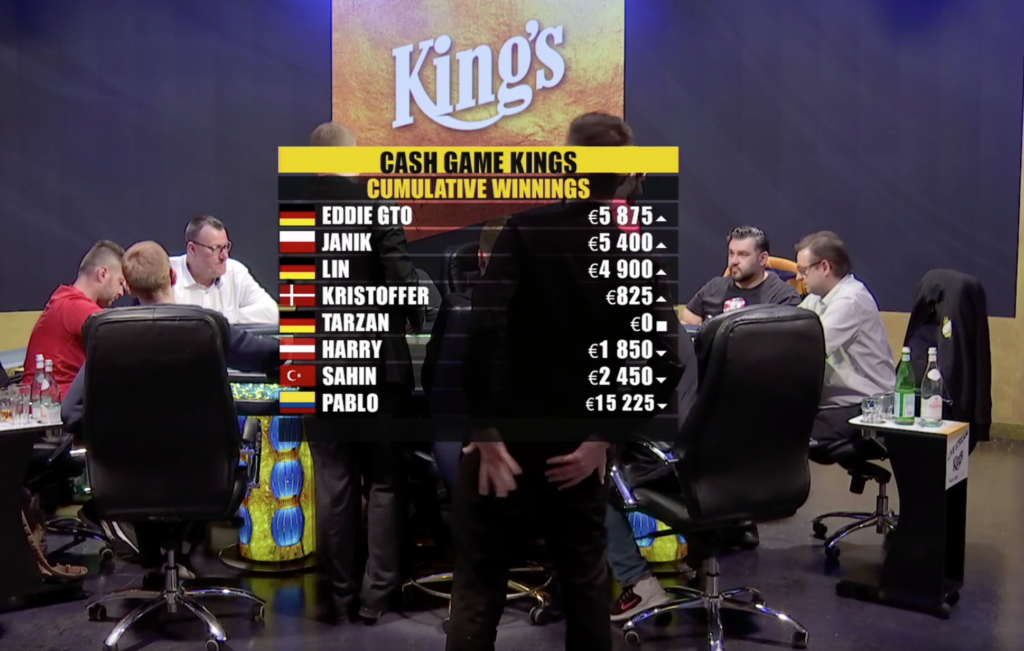 Zwei Spielern bekamen die Schnäpse besonders gut, Eddie (plus 5.875) und Janik (plus 5.400) waren die großen Sieger. Später kam Lin dazu und machte eine äußerst gute Figur (plus 4.900). Harry war ein guter Gastgeber und konnte seinen großen Gewinn von vorletzter Woche nicht wiederholen. Dieses Mal machte er 1.850 Euro minus. Doch keiner war so großzügig und actionwillig wie Pablo, der einen Kleinwagen (€15.225) am Tisch ließ.