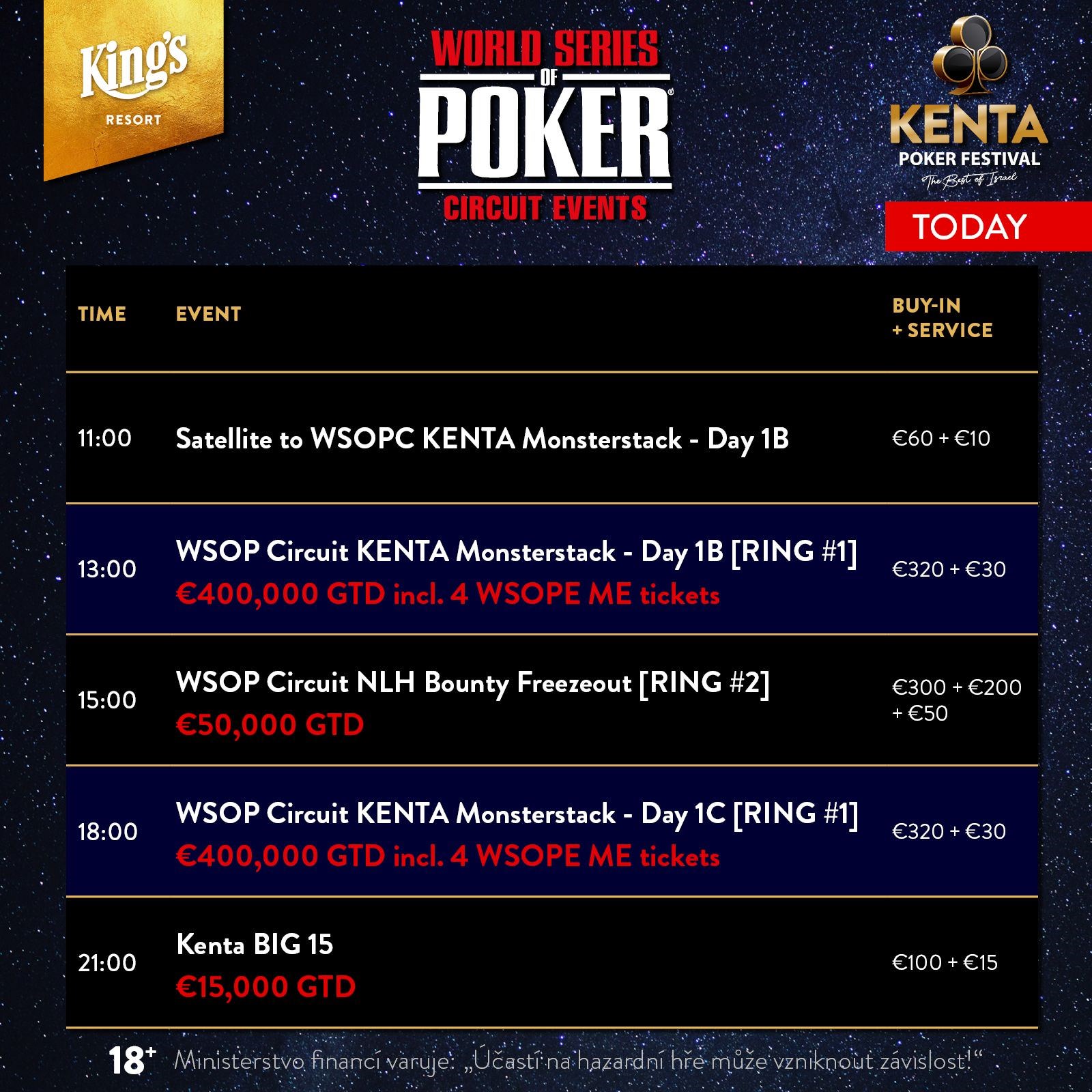 Am Freitag geht es im King’s Resort um 11:00 Uhr mit dem €60+€10 Satellite für den Tag 1b des €350 WSOPC Kenta Monsterstack Events los. Hier sind 15 Tickets garantiert.
