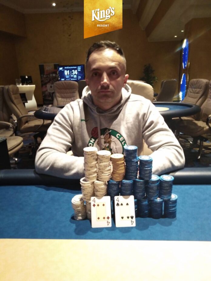 Im King’s Resort in Rozvadov steht derzeit alles im Zeichen des World Series of Poker Circuits. Doch auch trotz des WSOPCs und trotz des Corona-Virus, der auch die Verantwortlichen zum Handeln zwingt, wird im King’s der reguläre Spielbetrieb weiter geführt. So standen auch gestern vertraute Turniere und Side-Events auf dem Plan. Zum Beispiel wurde das €120 NLH Morning Turbo Bounty ausgespielt. Der Name ist ein kleines wenig irreführend, da das Turnier doch erst um 12 Uhr mittags begann und somit auch Langschläfer dabei sein konnten. 81 Spieler meldeten sich für das Turnier an, 19 kauften sich neu ein. 100 Total Entries sorgten für einen runden Preispool von €9.000.