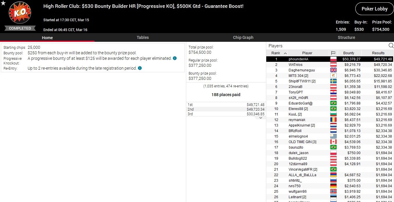 Aus deutschsprachiger Sicht wusste vor allem Europameister Christian „WATnlos“ Rudolph zu überzeugen. Er belegte beim $530 Bounty Builder hinter „phounderAA“ aus Polen Platz 2 und kassierte rund $59.000.