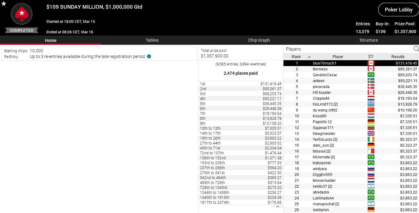 13.759 Entries wurden beim Turnierflaggschiff, der $109 Sunday Million verbucht, womit einmal mehr die Garantie sicher geknackt wurde.