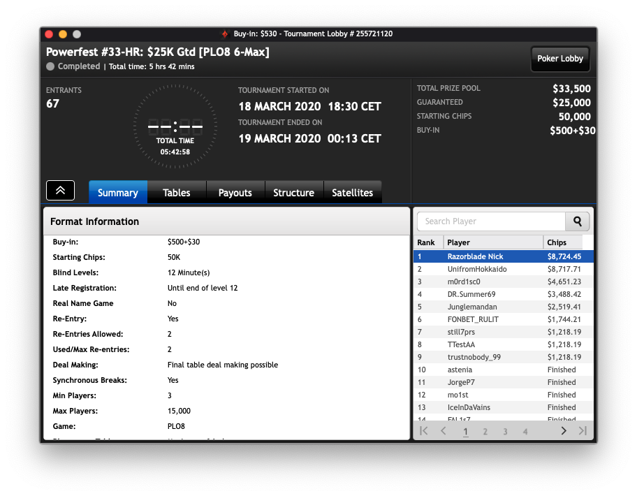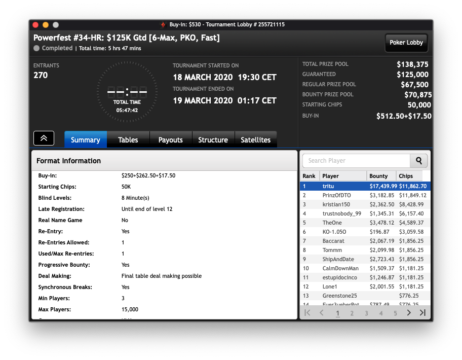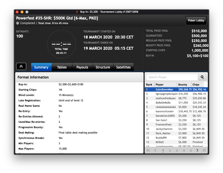 Dabei konnte sich der Mitgründer der Poker-DTO-App Markus Prinz stark platzieren. Bei Event #70-SHR, einem $530-Buy-In-Turnier, fanden sich 270 Spieler zusammen. Damit war ein Preispool in Höhe von $138.375 gebildet. Den Sieg schnappte sich „tritu“ für $17,439,99 an Bounties und $11.862,70 für seine Platzierung. Prinz schnappte sich als „PrinzOfDTO“ den zweiten Platz und gewann $3.182,85 mit Bounties, für die Platzierung gabs $11.849,12.