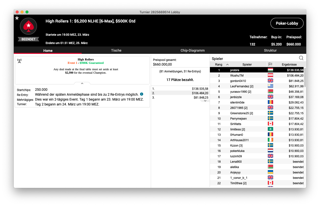 Geld gab es für die ersten 17 Spieler, wovon sich Poker-Pro Andras Nemeth aus Ungarn den größten Teil zusicherte. Er bekam für seinen Sieg $138.535,58. Als Runner-Up platzierte sich Thomas „WushuTM“ Mühlöcker. Dafür gab es für den Österreicher $106.484,20. Vicent „gordon0410“ Bosca bekam für den dritten Platz $81.848,25.