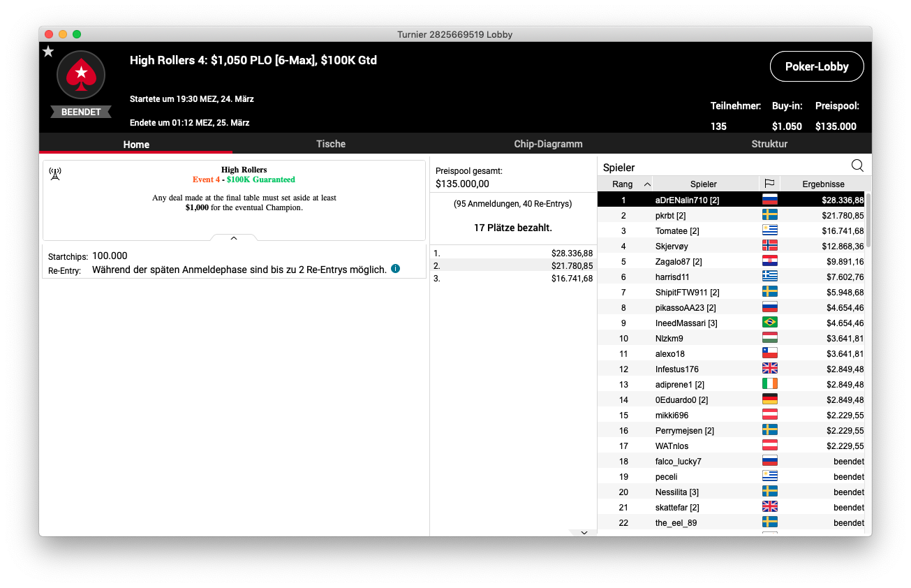 Bei Event 4 gab es $100k garantiert für PLO-Spieler, die für $1.050 in einem 6-Max in den Ring steigen wollten. Insgesamt 90 Spieler, die 40 Re-Entries nutzten, waren dabei und so ging es um einen Preispool von $135.000. Als Sieger setzte sich am Ende Denis „aDrENalin719“ Strebkow durch, der dafür $28.336,88 mit nach Hause nehmen durfte. „pkrbt“ aus Schweden schnappte sich $21.780,85 für Platz 2. Francisco „Tomatee“ Benitez wurde Dritter für $26.741,68.