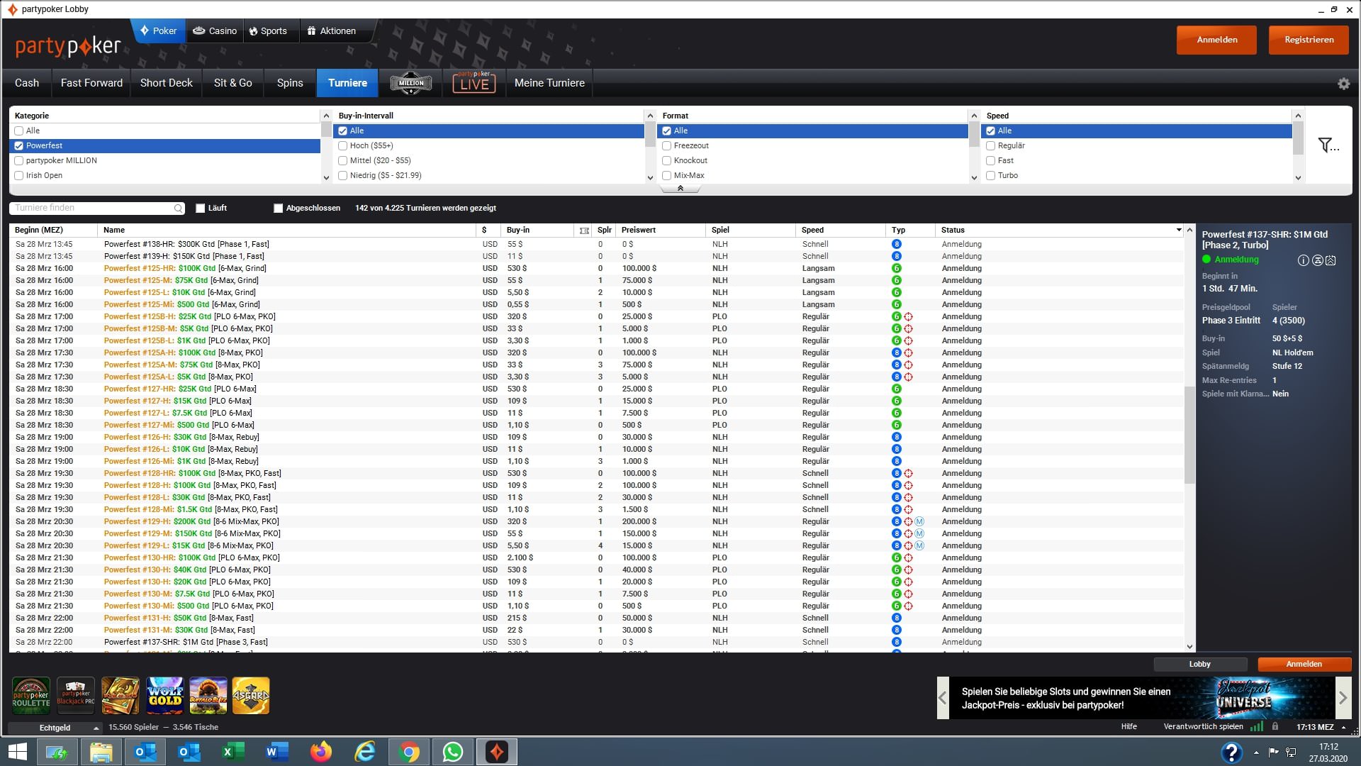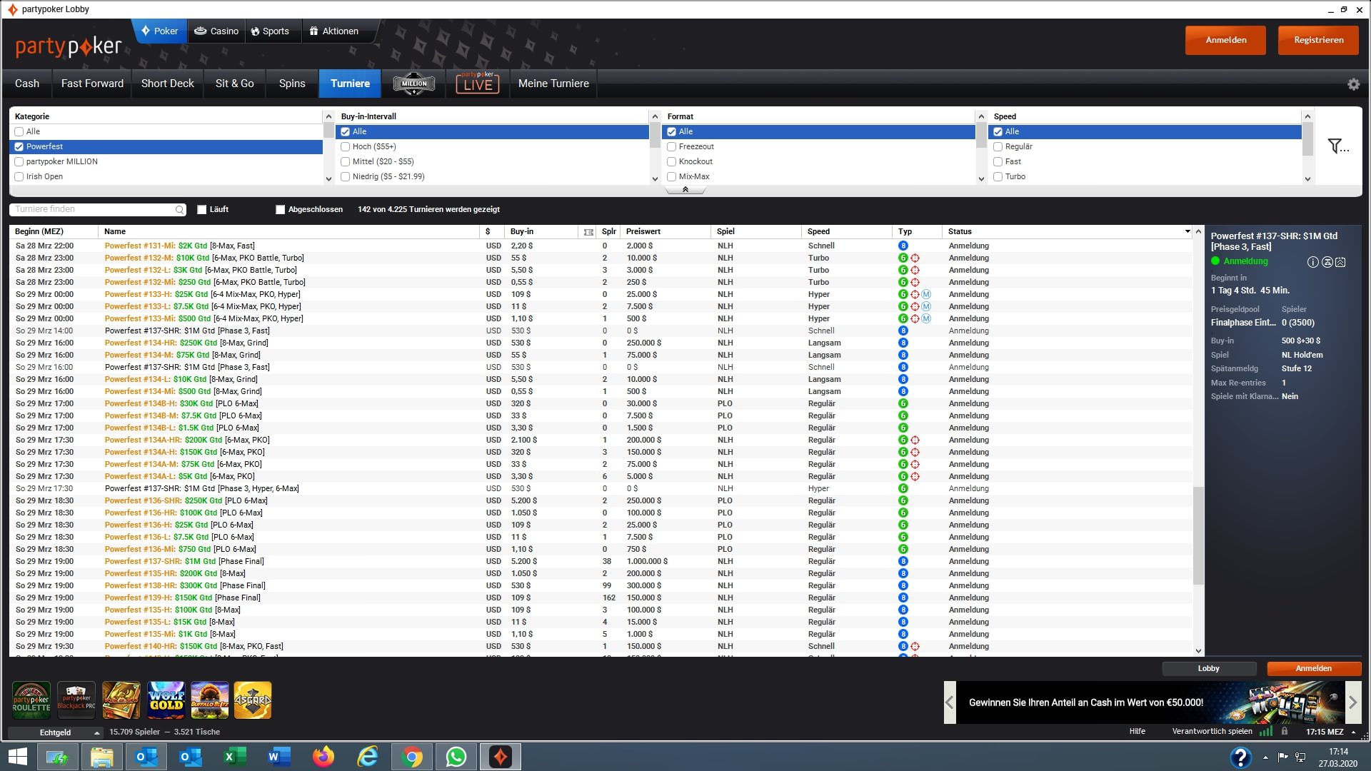 Am Samstag ist beim partypoker Powerfest wieder Hochbetrieb. Es stehen 35 Turniere mit Buy-Ins zwischen $0.55 und $2.100 auf dem Programm. Insgesamt geht es hier um garantierte Preisgelder in Höhe von $1.265.333.