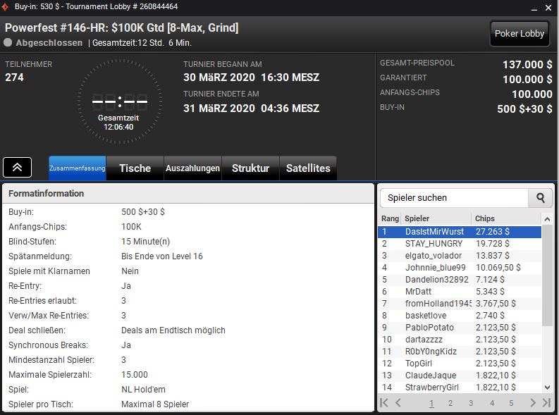 Bei 274 Entries wurden insgesamt $137.000 an Preisgeldern ausgespielt. „DasIstMirWurst“ setzte sich diesmal im Heads-up gegen „STAY_HUNGRY“ durch und räumte $27.263 Prämie ab. Bei seinem ersten Sieg waren es $21.205.