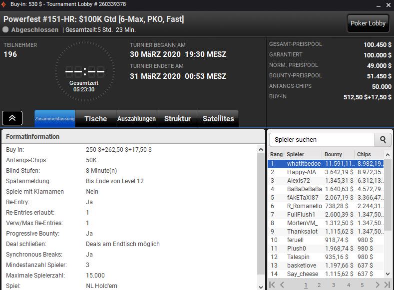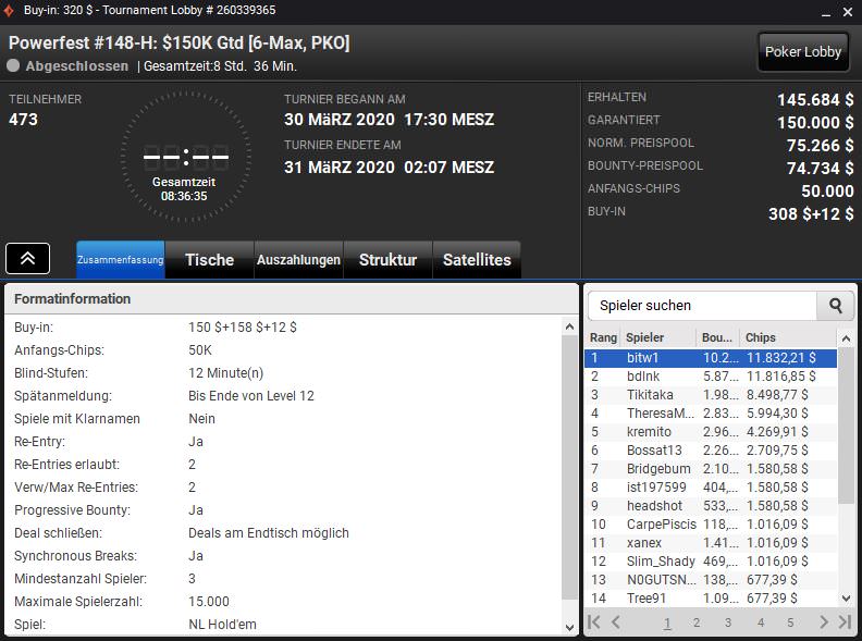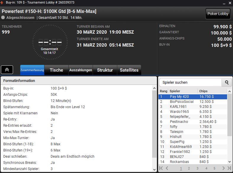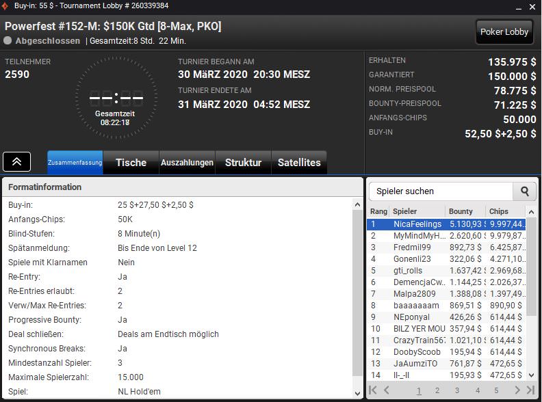 Außerdem gewann El_Cucuy das $1.050 NLHE 8-6 Mix-Max (150-HR) für $35.518,80 und IhateTheChanges das $320 NLHEPKO (152-H) für $14.745,42 plus $19.482,24 an Bounties.