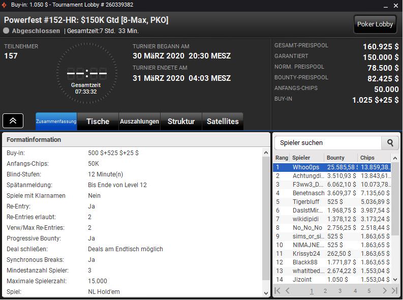 Gewinner des Spieltags war aber „Whoo0ps“. Er gewann das $1.050 NLHE PKO (152-HR) samt $13.859,38 Preisgeld und $25.585,58 an Bounties vor „AchtungdieKurve“, der neben $13.843,61 zusätzlich $3.510,93 an Bounties kassierte.