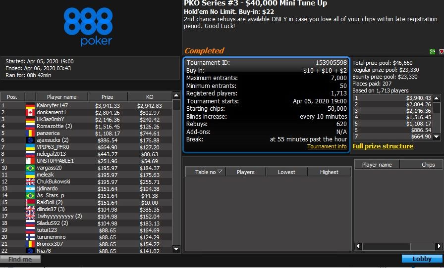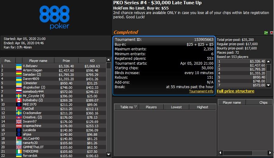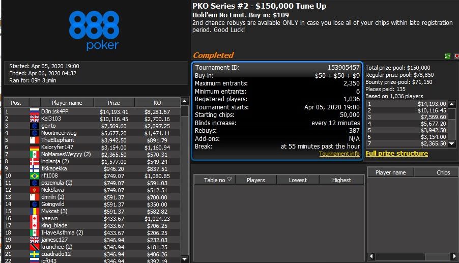 Bei Event #3, dem $22 Mini Tune Up, schnappte er sich für knapp $7.000 Preisgeld den Sieg, und bei Event #2, dem $109 Tune Up, schnappte er sich mit Platz 6 die nächsten gut $4.200.