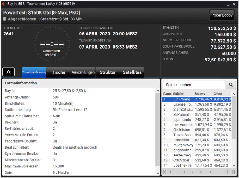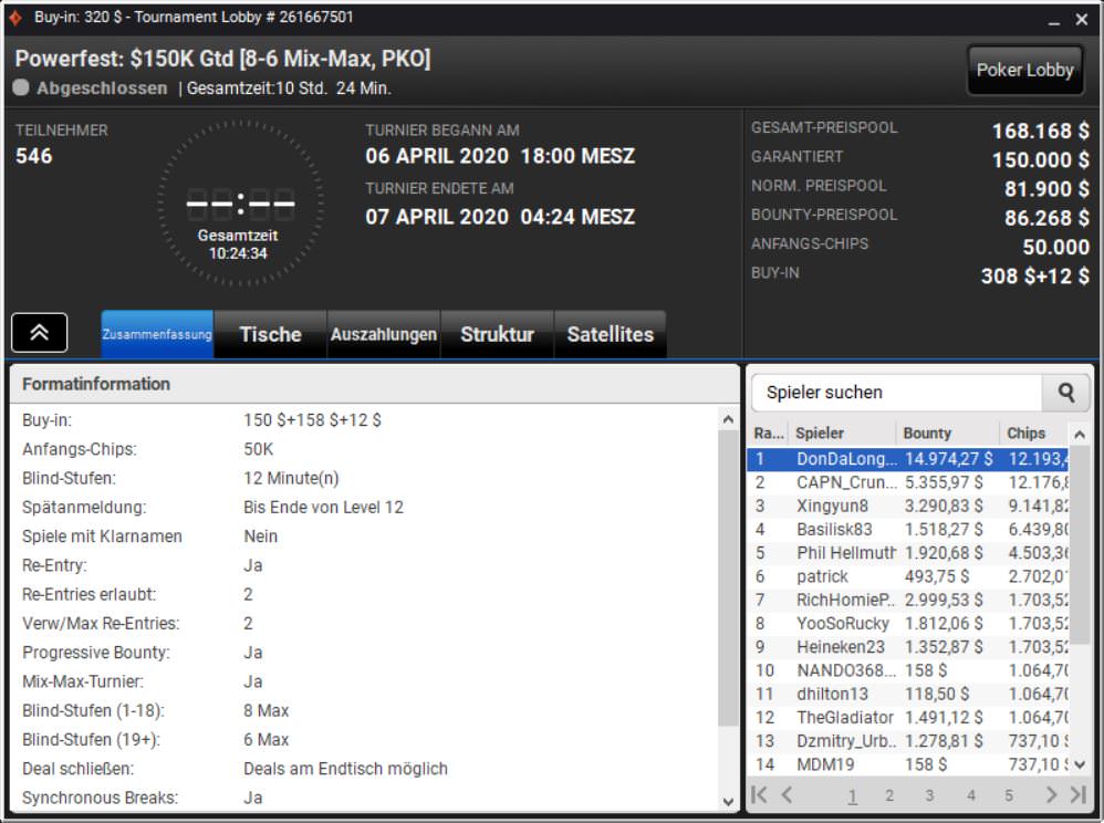 “DonDaLong” gewann beim $150K-Event und kassierte $12.193,42 + $14.974,24 in Bounties.