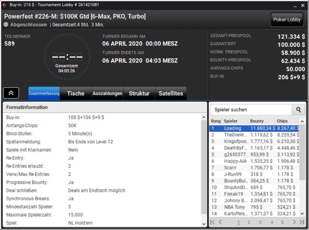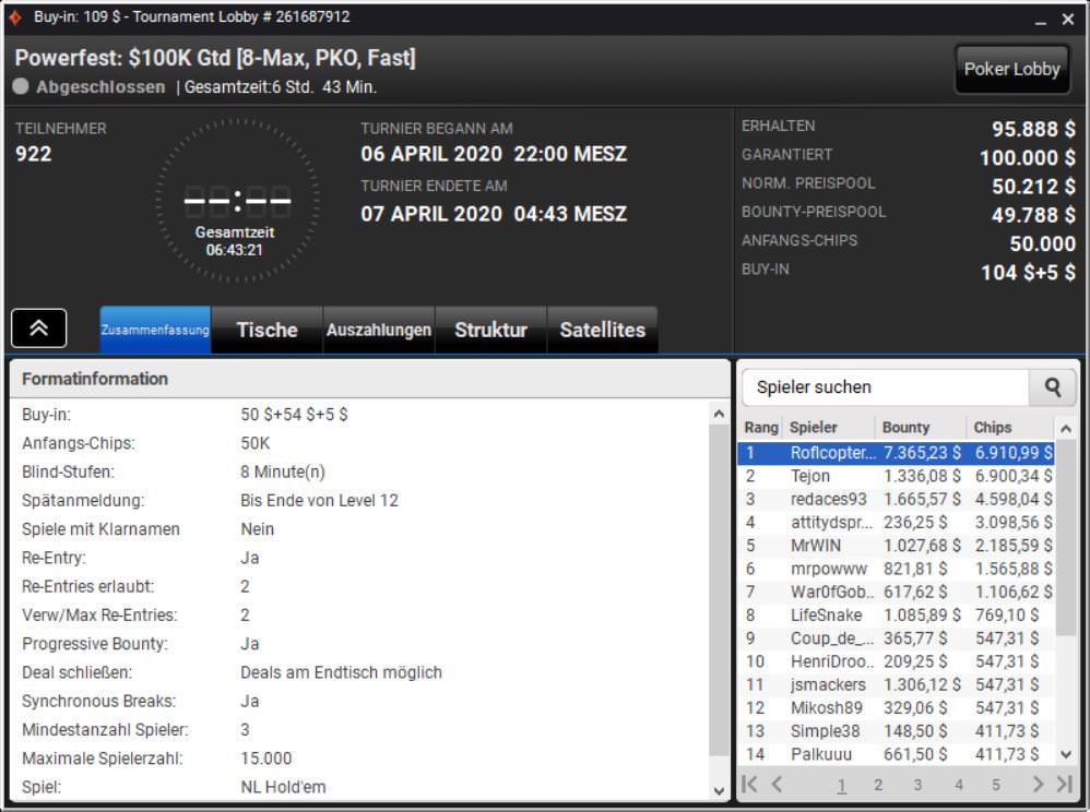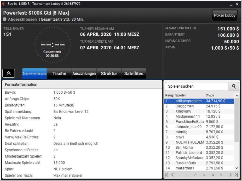 Der Spieler „attitysdproblem“ triumphierte beim $100K-Event und kassierte $34.710,90. Beim gleichen Event schaffte es der Spieler “Cagggmen” für $24.915 auf Platz zwei.