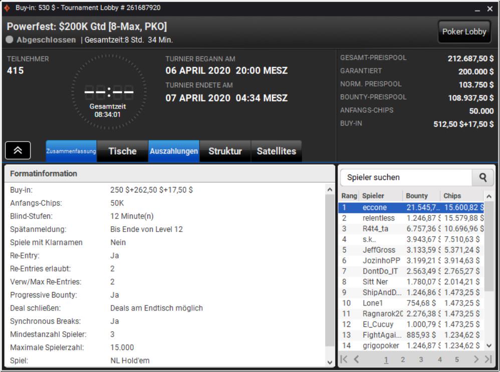 Der größte Preispool des Tages mit $212.687,50 ist beim $200k-Event zusammengekommen. Der Sieg ging bei diesem Event an den Spieler „eccone“. Für den Sieg erhielt er $15.600,82 und außerdem $21.547,70 in Bounties. Auf Platz zwei schaffte es „relentless“ für $15.579,88 und $1.246,87. Auf dritter Position folgt „R4t4_ta“ für $10.696,96 + $6.757.36.