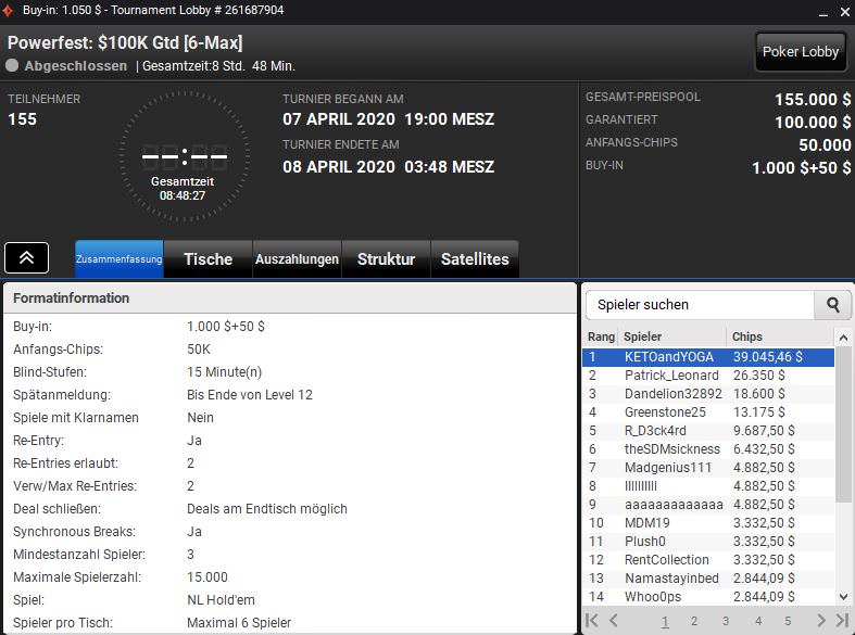 Für partypoker Pro Patrick Leonard reichte es nicht ganz zum Turniersieg. Er musste sich beim $1.050 NLHE 6-Max „KETOandYOGA geschlagen und mit $26.350 Preisgeld zufrieden geben. „KETOandYOGA“, der 2018 den Powerfest Super High Roller Event für knapp $900.000 gewonnen hat, bekam diesmal $39.045,46 ausbezahlt.