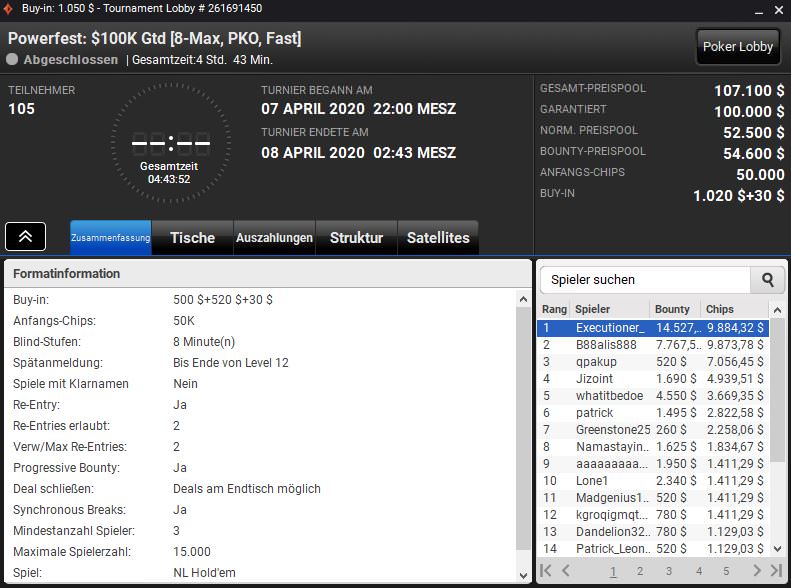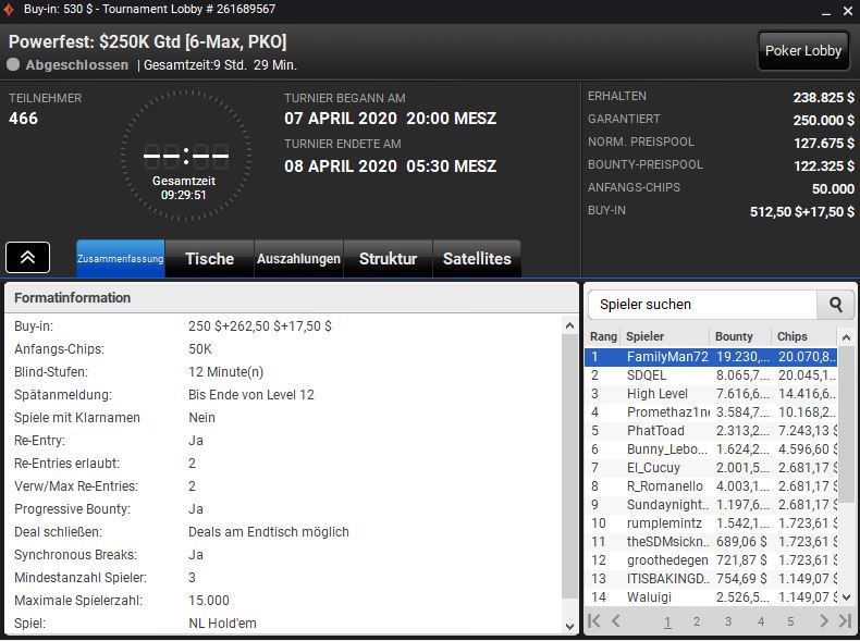 Den Sieg beim $530 NLHE 6-Max PKO holte FamilyMan72, der neben $20.070,89 Preisgeld zusätzlich $19.230,34 an Bounties kassierte.