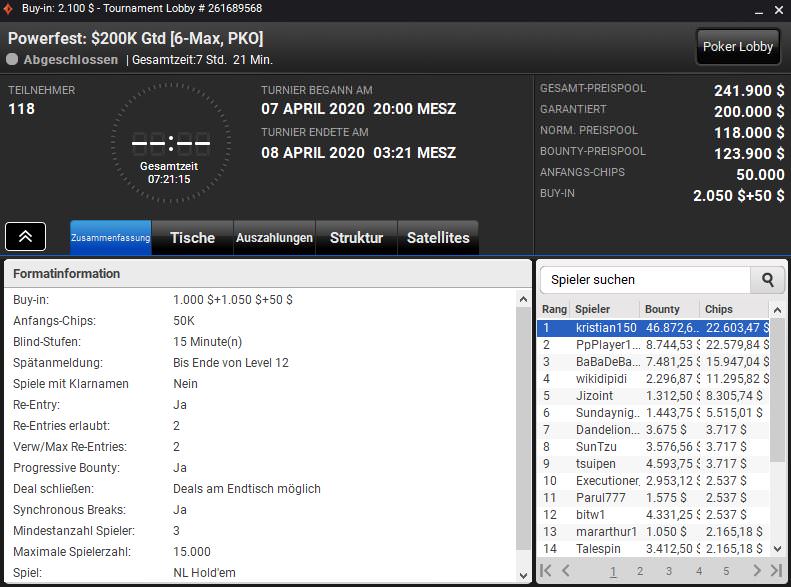 Beim partypoker Powerfest war gestern „kristian150“ der ganz große Abräumer. Der Finne gewann das $2.100 NLHE 6-Max PKO und schnappte sich mit insgesamt $69.4765,14 das größte Stück vom $241.900-Preispool.