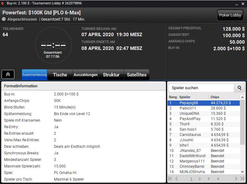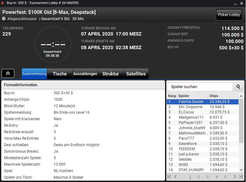 Siegreich waren außerdem Fabrice Soulier ($23.346,55) beim $530 NLHE Deepstack, onehundredeyez ($11.519,57/$15.486,55) beim $320 NLHE PKO und Pepapig88 ($44.276,23) beim $2.100 PL Omaha 6-Max.