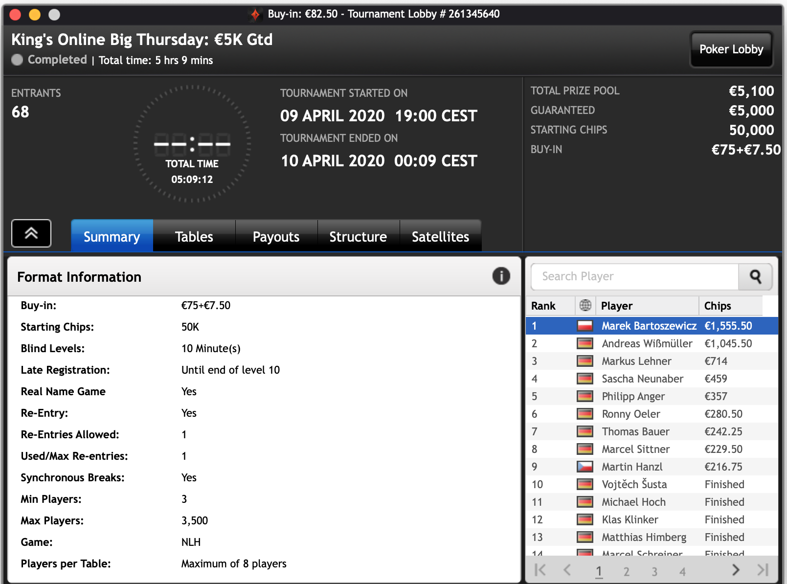 Zum Big Thursday kamen 68 Spieler zusammen, die für ein Buy-In von €75+7,50 mit dabei waren. Es gab eine Garantie von €5.000, die mit €5.100 geknackt wurde. Am Ende machte der Pole Marek Bartoszewicz €1.555,50 das Rennen. Andreas Wißmüller wurde Runner-Up für $1.045,50. Dritter wurde Markus Lehner für €714