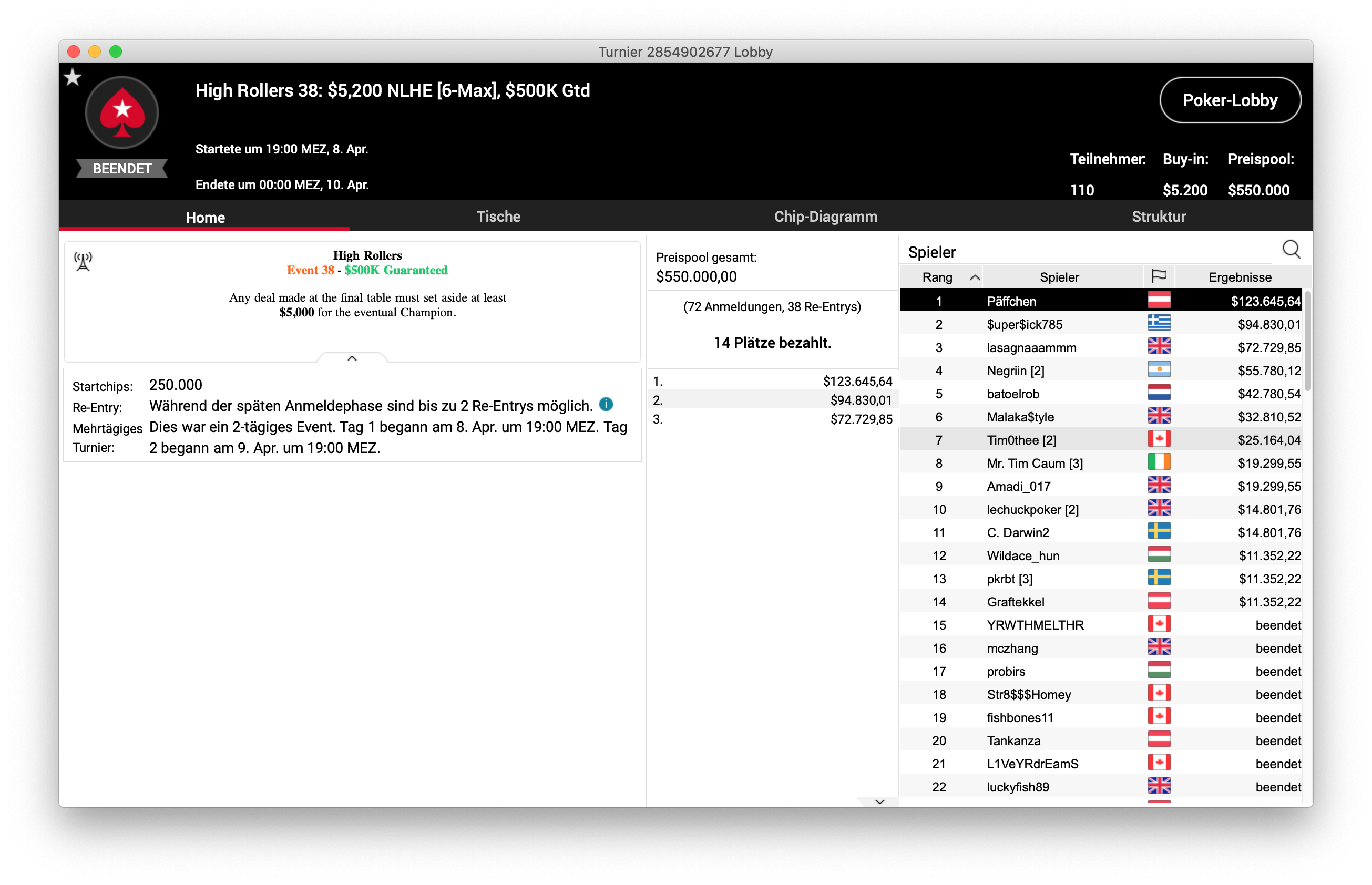 Am gestrigen Donnerstag ging das Event 38 zu Ende, bei dem 72 Spieler insgesamt 110 Entries für $5.200 nutzten. Damit ging es um einen Preispool von $550.000. Den größten Stück vom Kuchen schnappte sich Pascal Hartmann, der als „Päffchen“ auf PokerStars unterwegs ist. Er gewann $123.645,64. Auf Rang 2 platzierte sich der Grieche „$uper$ick785“, der für den Runner-Up $94.830,01 bekam.