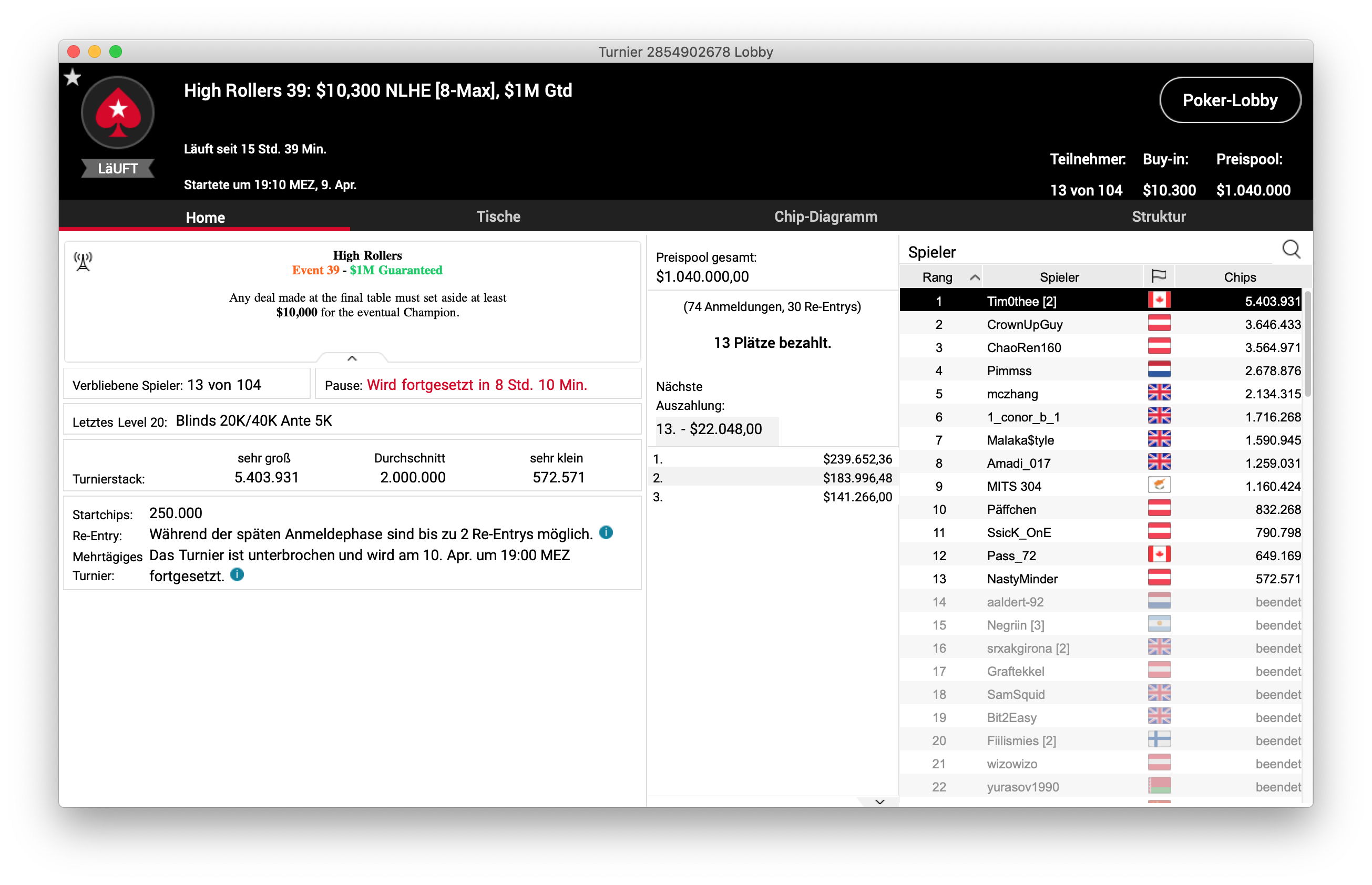 Heute geht Event 39 in seinen Finaltag. 74 Spieler entschieden sich für ein Buy-In von $10.300 insgesamt für 104 Entries. Damit stand ein Preispool von $1.040.000 fest. Erster im Rennen ist derzeit Timothy Adams aka „Tim0thee“, der 5,4 Mio. Chips hat. Zweiter ist Fedor „CrownUpGuy“ Holz, der derzeit 3,6 Mio. Chips hat. Mikael „ChaoRen160“ Thuritz folgt Holz mit 3,5 Mio. Chips auf Rang 3. Auch Pascal Hartmann ist noch mit dabei, er ist 10er in Chips mit knapp 800k. Weiter ist Claas Segebrecht aka „SsicK_OnE“ noch mit im Rennen, er hat als 11er 790k.