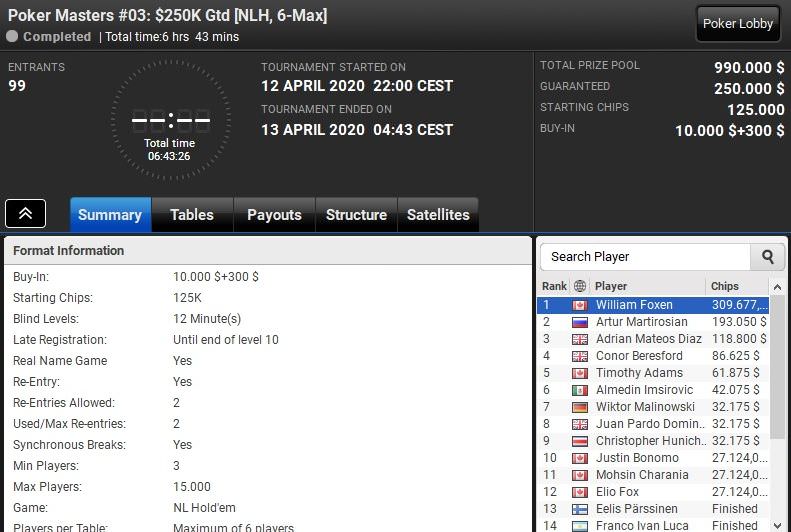 Auch hier gingen viele bekannte Spieler wie Fedor Holz, Sam Greenwood, Dan Smith oder Adrian Mateos an den Start, doch den Sieg holte sich der Amerikaner Alex Foxen.