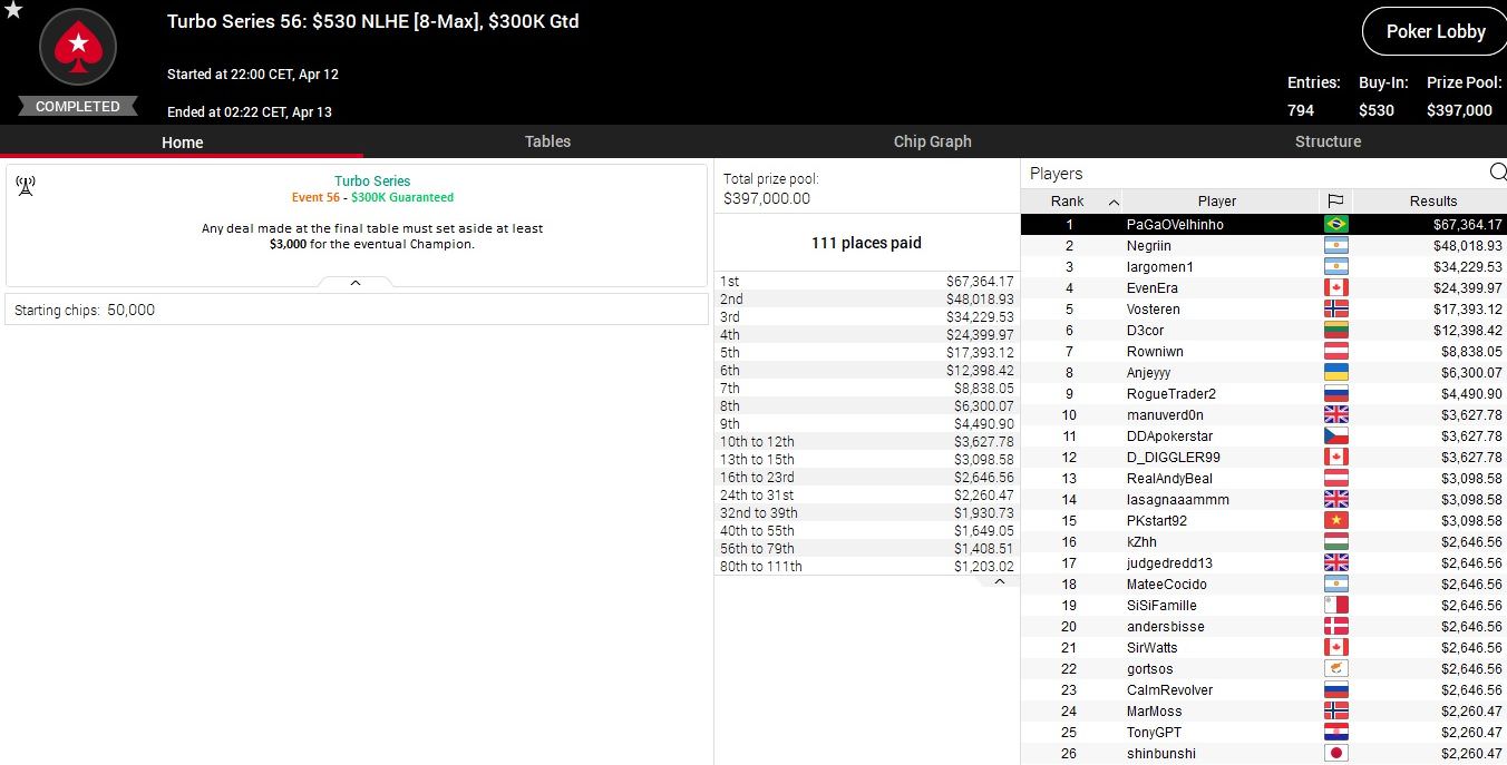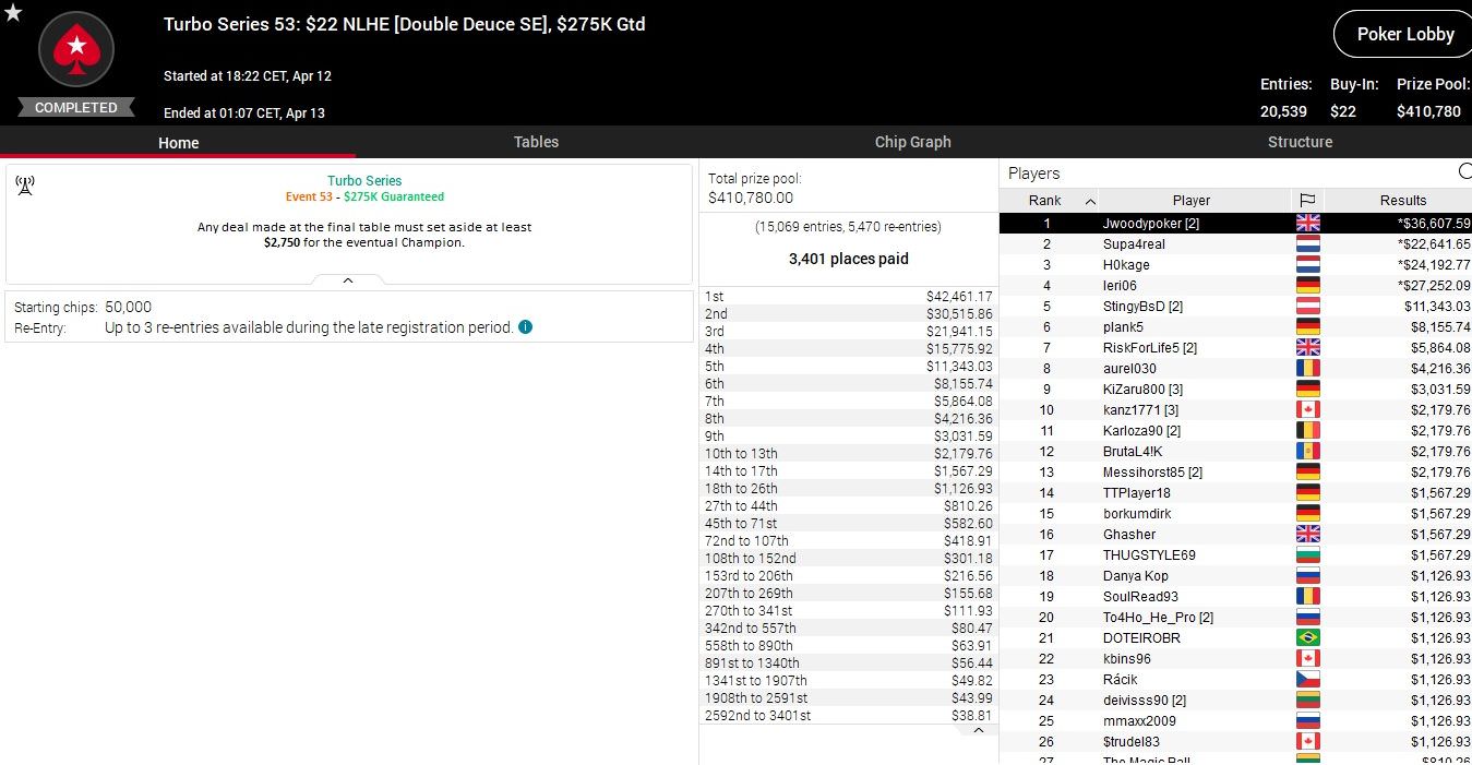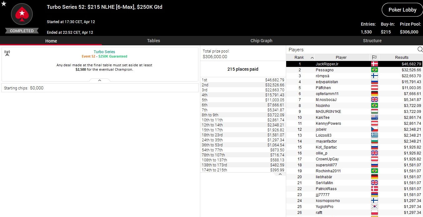 Heute stehen bei der Turbo Series sieben weitere Turniere an, die Anfangszeiten findet ihr in der Lobby von PokerStars.