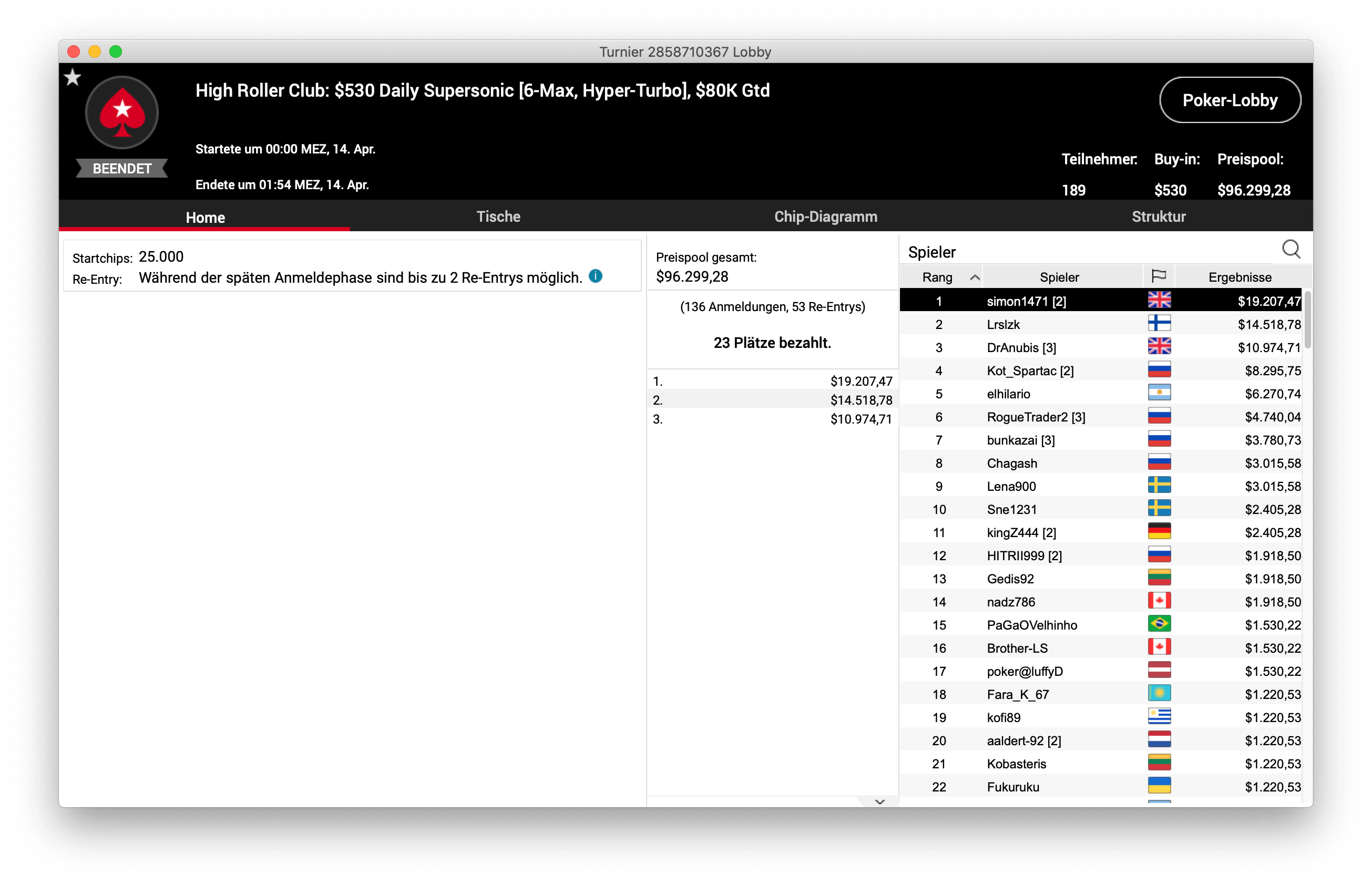 Das $530 Daily Supersonic, ein 6-Max Hyper Turbo, lud 136 Spieler ein, die insgesamt 189 Entries verbuchten. Damit war ein Preispool von $96.299,28 vakant. Den schnappte sich zu großen Teilen ebenfalls „simon1471“ aka Simon Higgins. Er bekam für seinen zweiten Sieg an diesem Tag $19.207,47. Runner-Up wurde Highroller Sami „Lrslzk“ Kelopuro für $14.518,78.