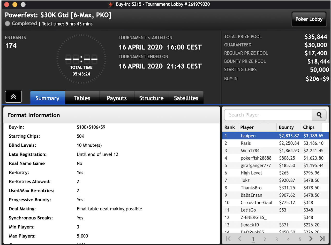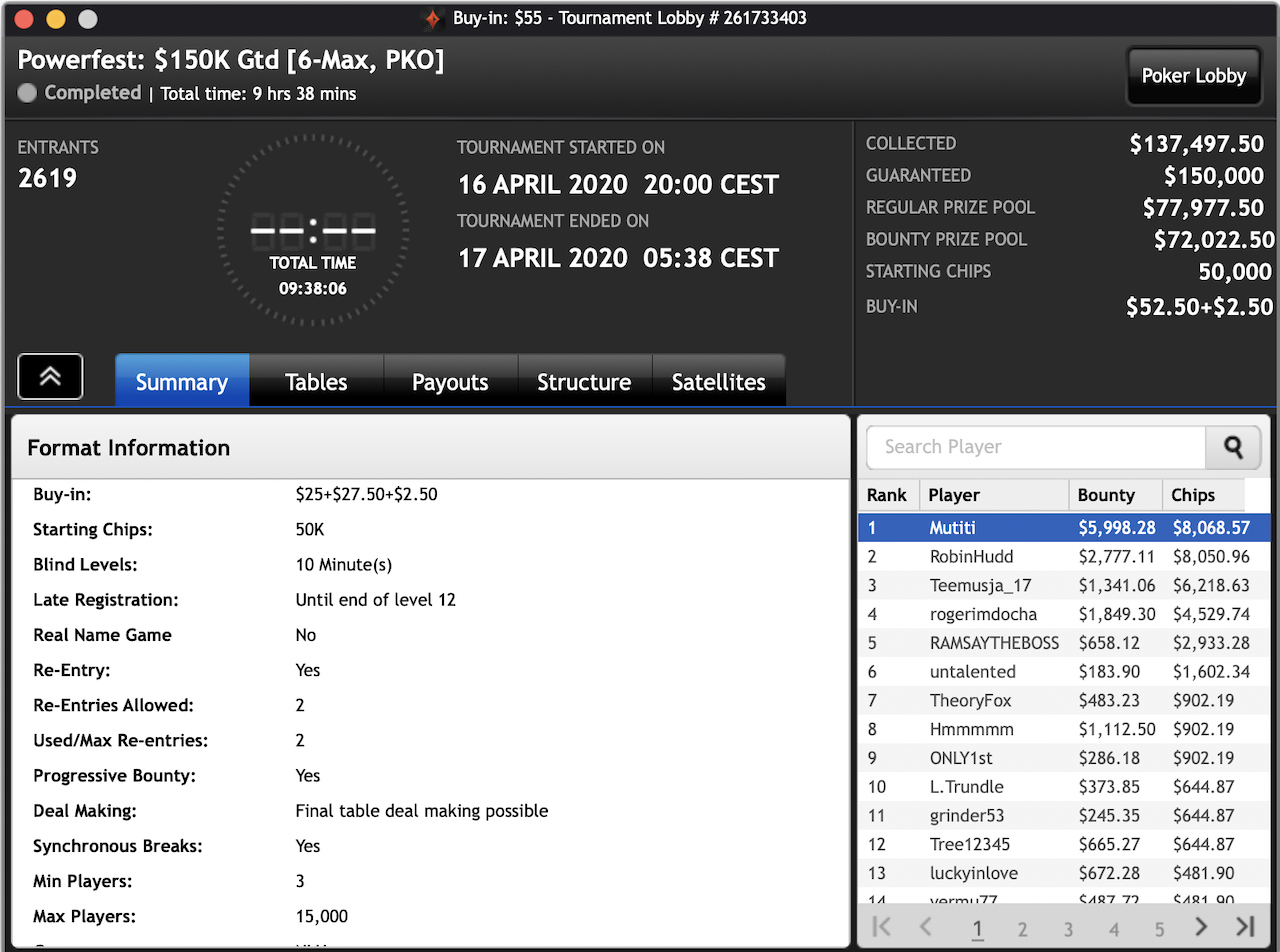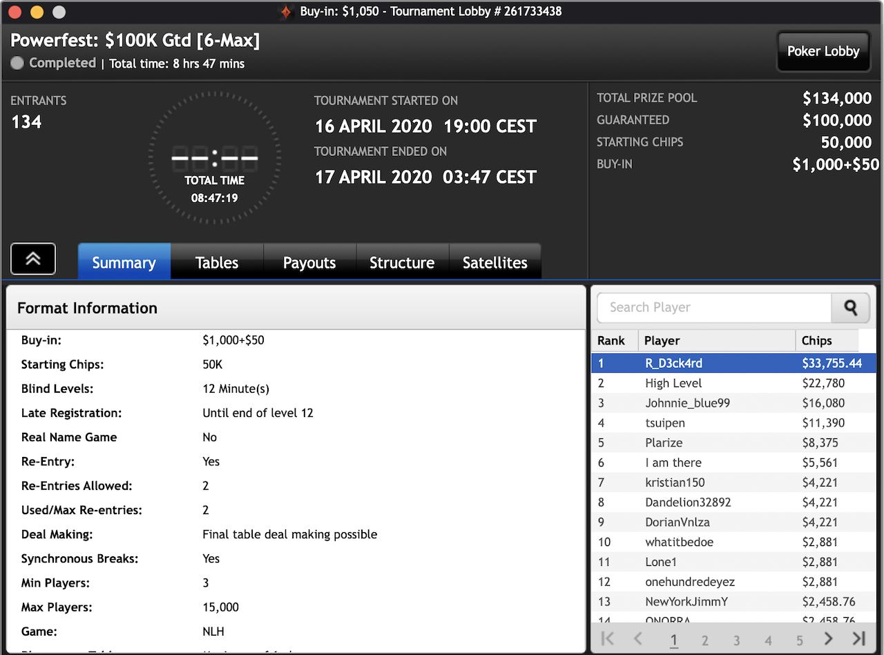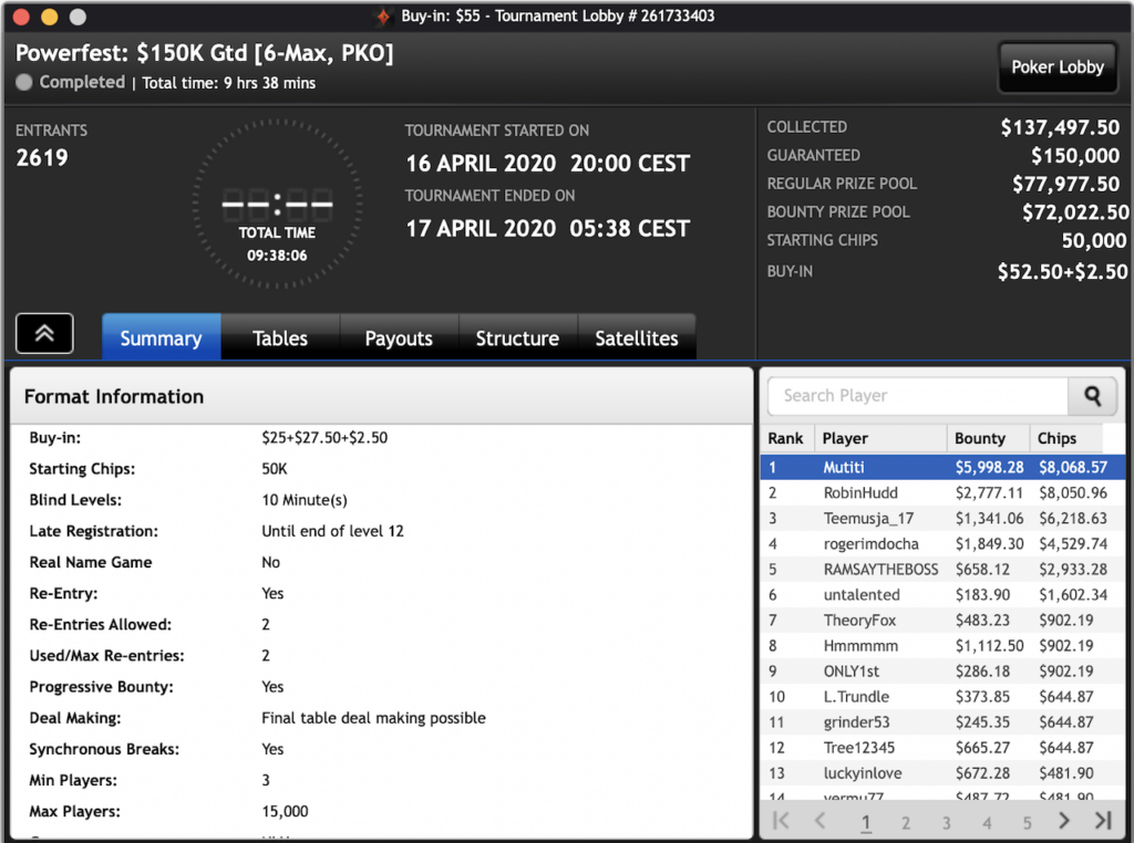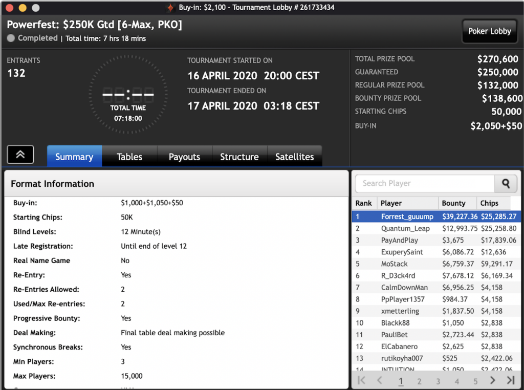 Das $2.100 6-max PKO Turnier ging an Forrest_guuump für zusammen knapp $65.000 Siegeslohn. Er musste dazu ein Feld von insgesamt 132 Spielern hinter sich lassen.