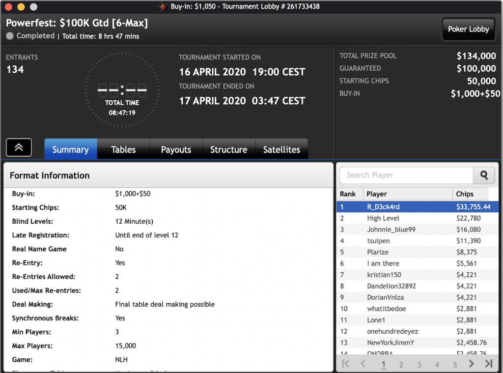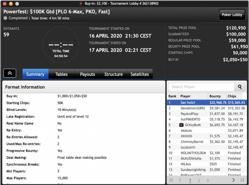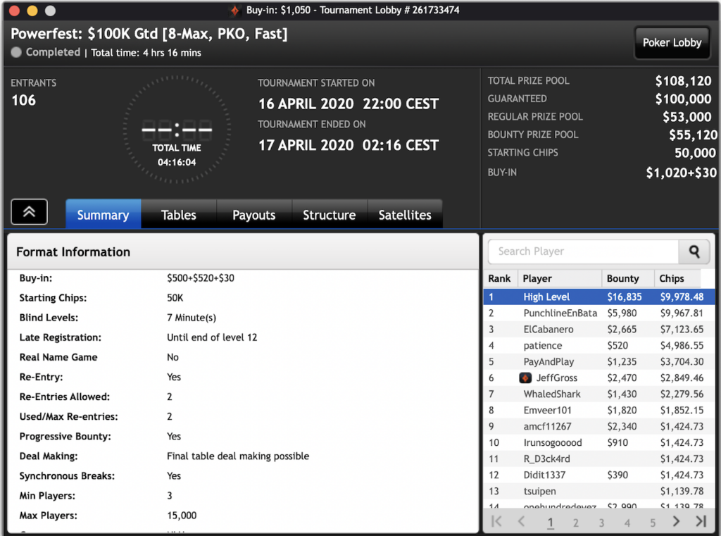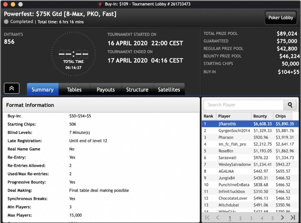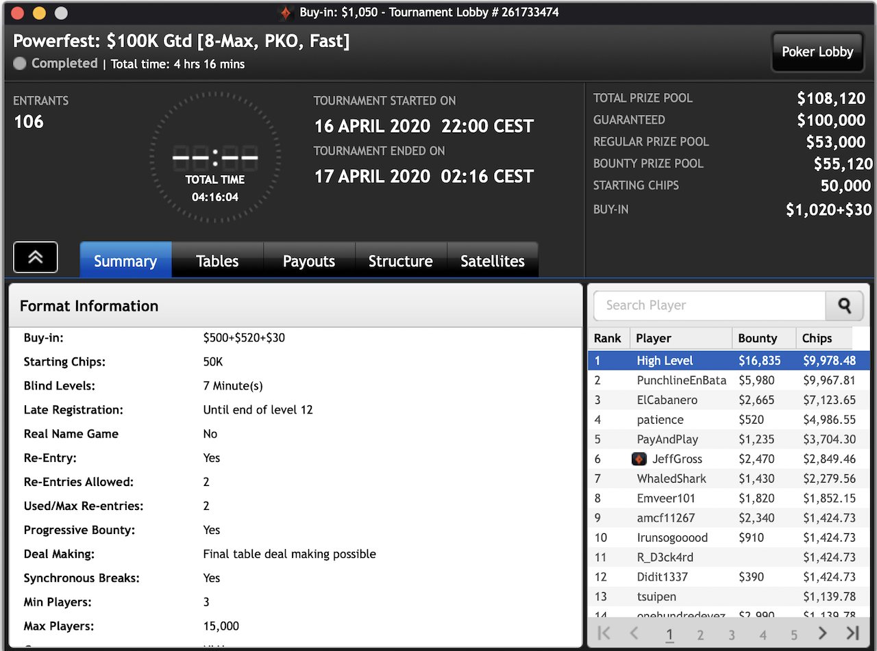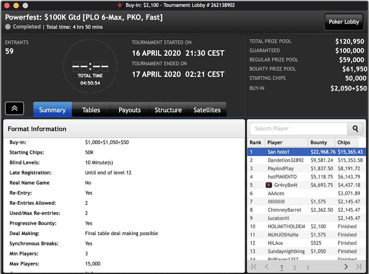 Das $2.100 6-max PKO Turnier ging an Forrest_guuump für zusammen knapp $65.000 Siegeslohn. Er musste dazu ein Feld von insgesamt 132 Spielern hinter sich lassen.