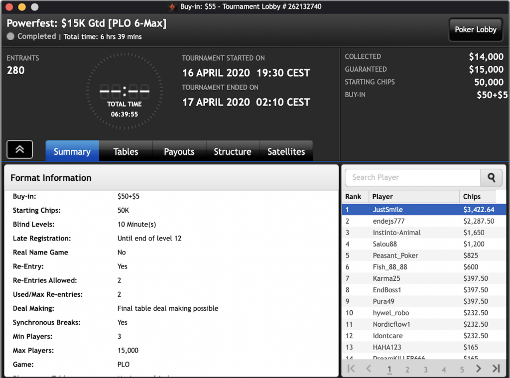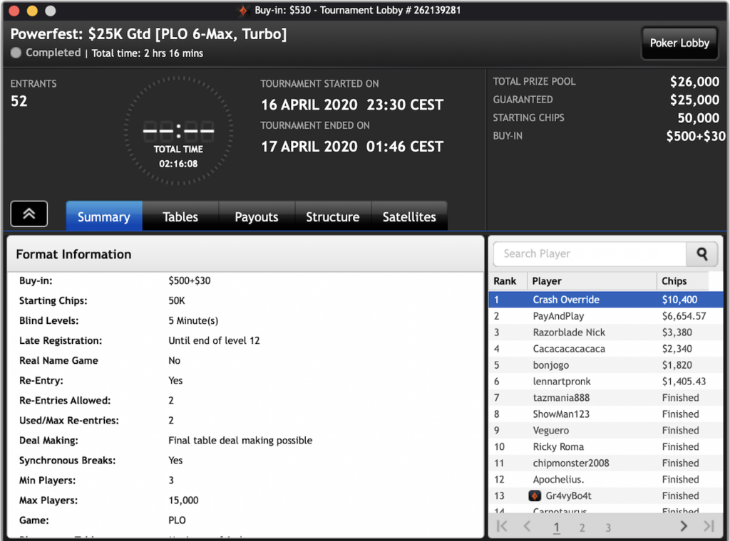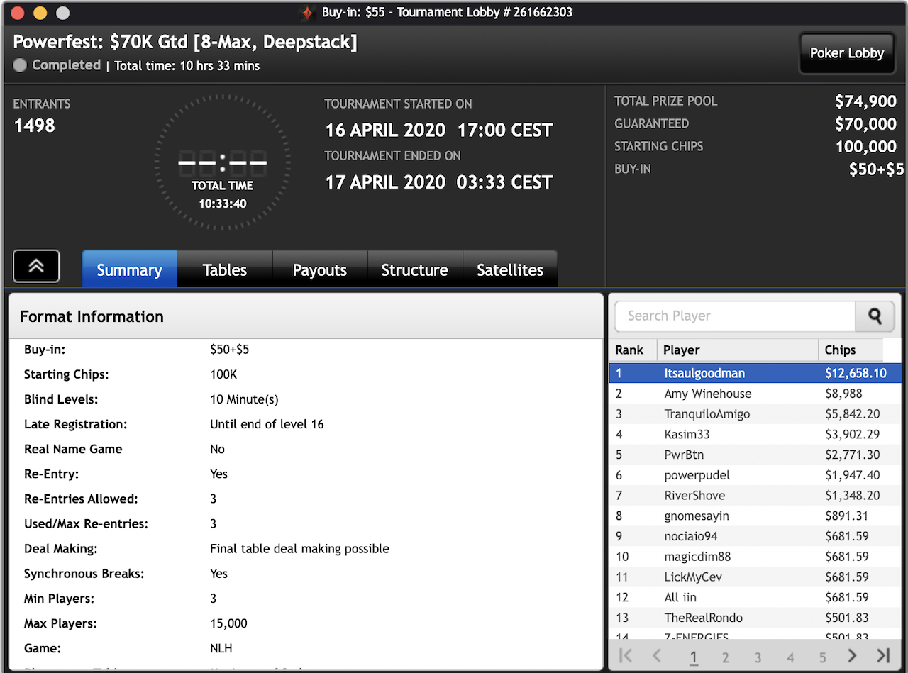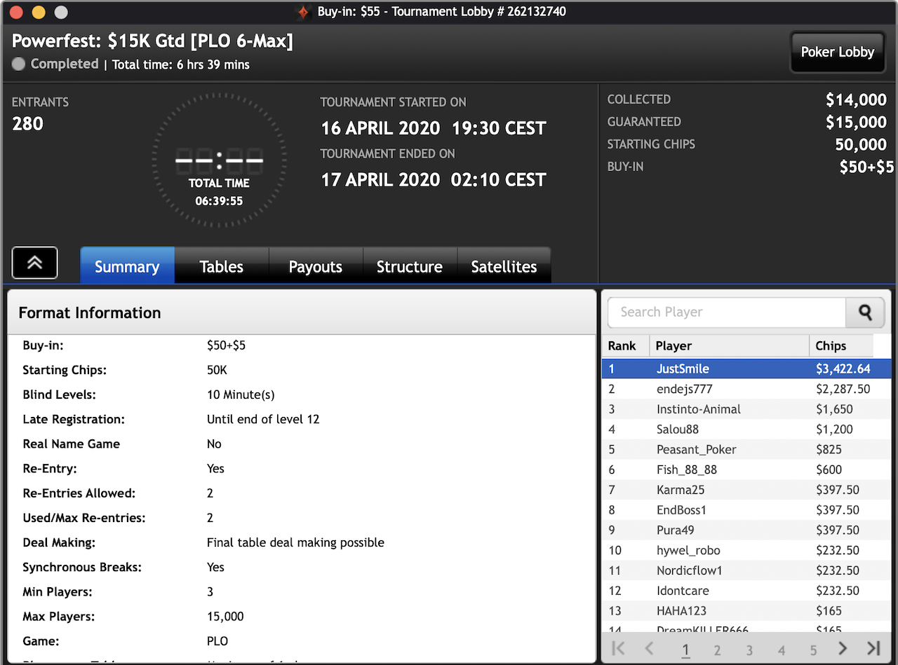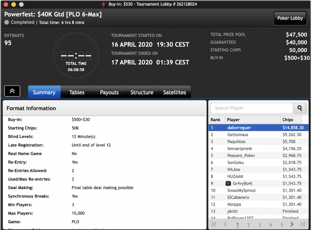 Das $2.100 6-max PKO Turnier ging an Forrest_guuump für zusammen knapp $65.000 Siegeslohn. Er musste dazu ein Feld von insgesamt 132 Spielern hinter sich lassen.