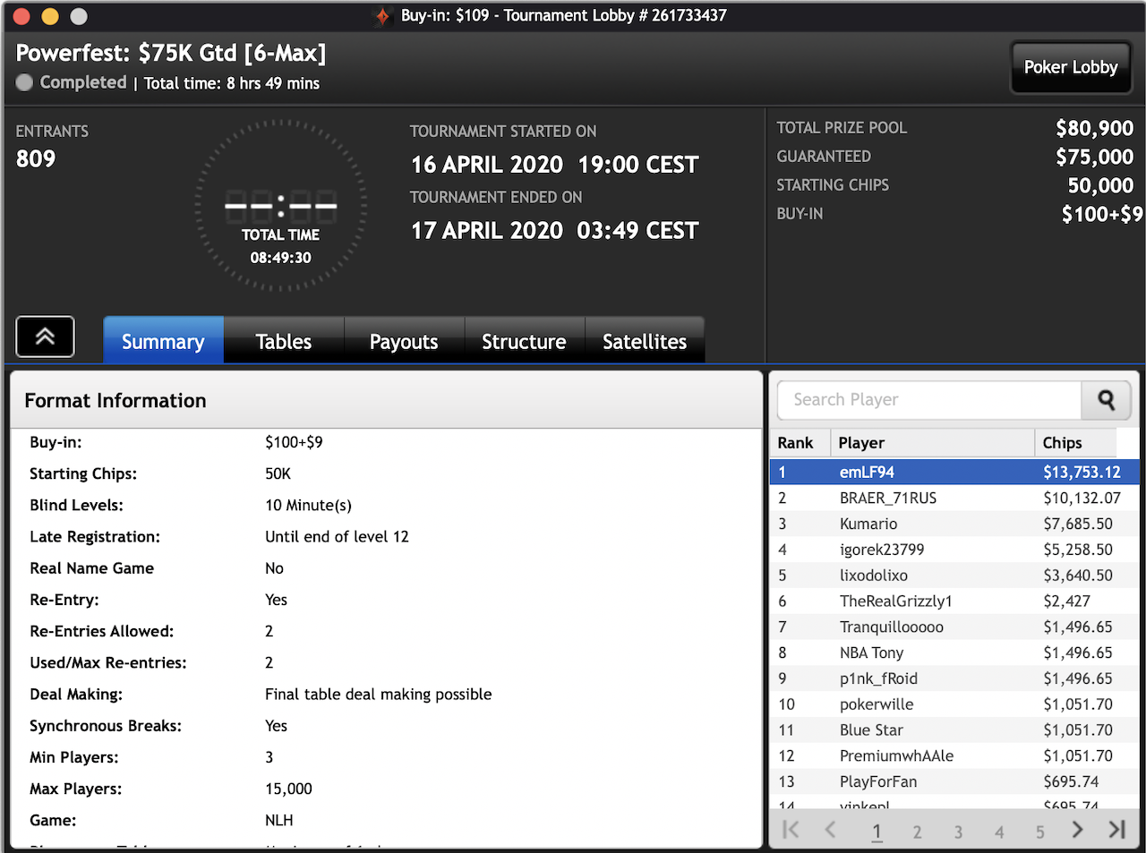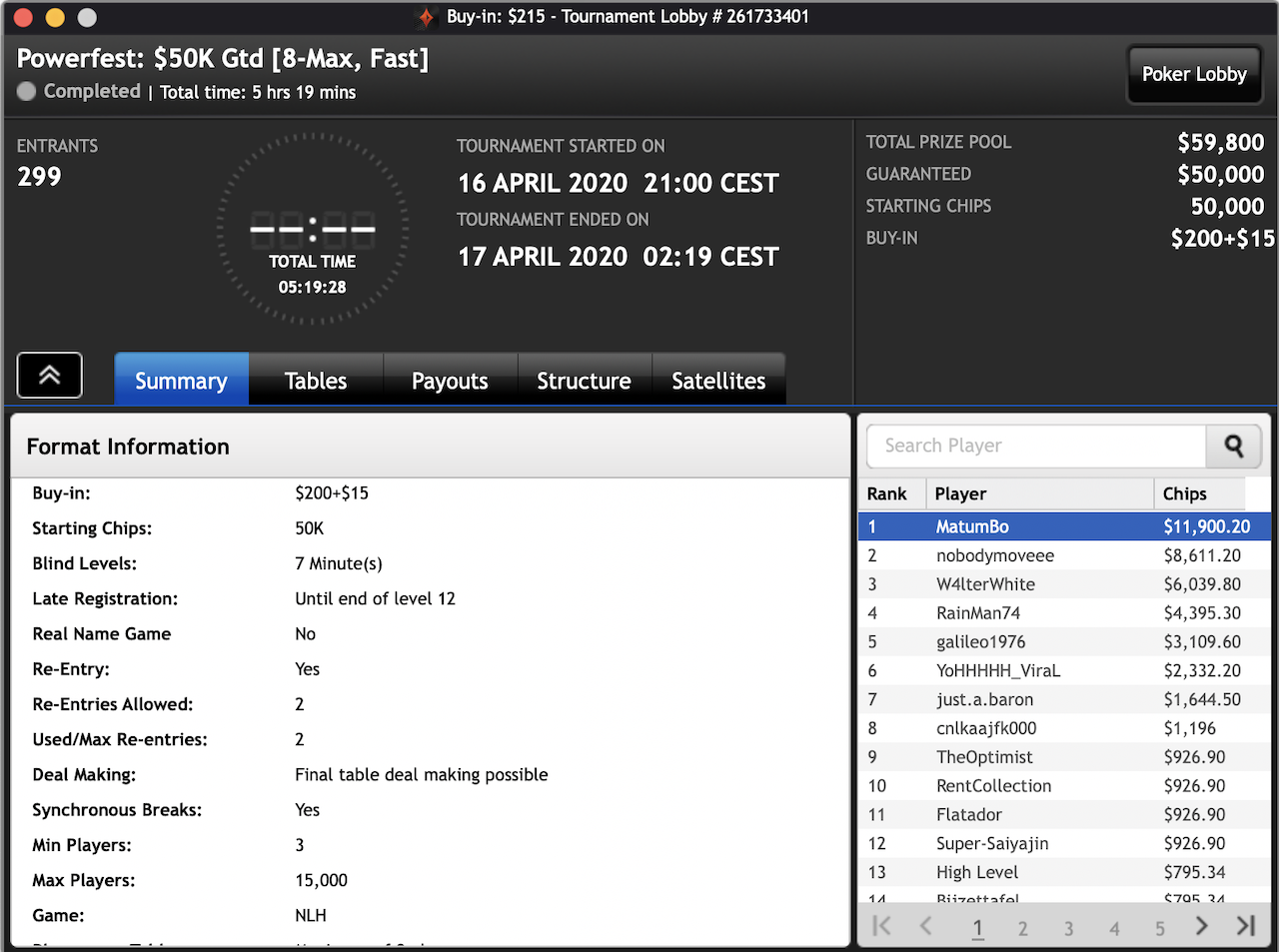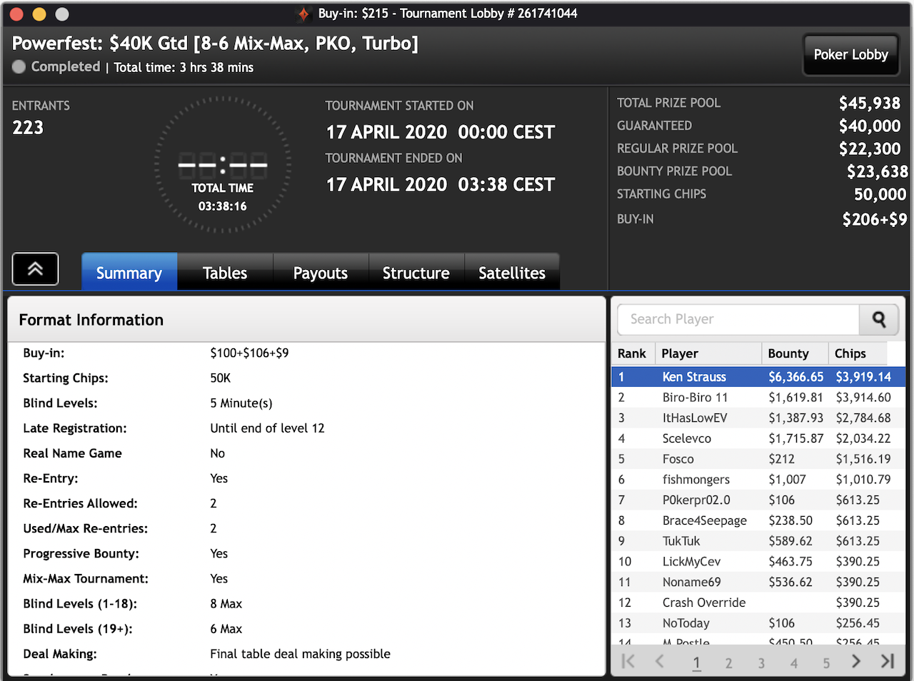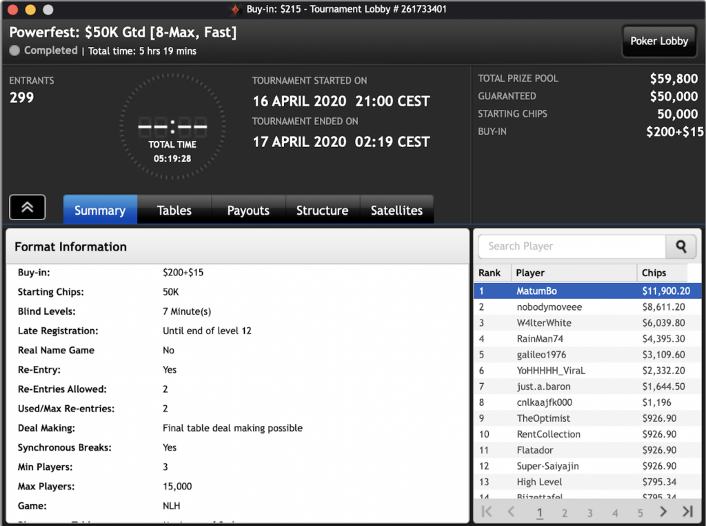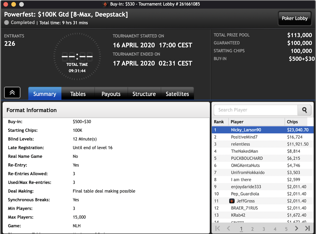 Das $2.100 6-max PKO Turnier ging an Forrest_guuump für zusammen knapp $65.000 Siegeslohn. Er musste dazu ein Feld von insgesamt 132 Spielern hinter sich lassen.