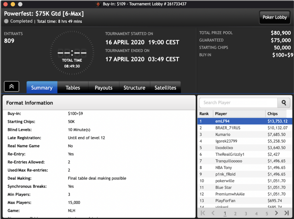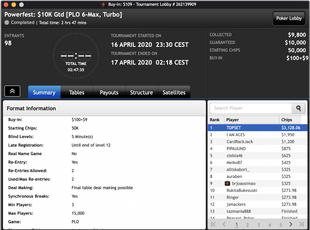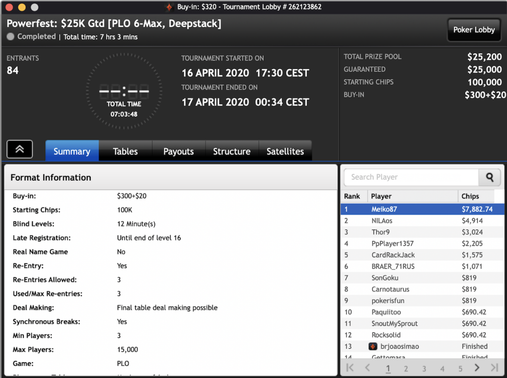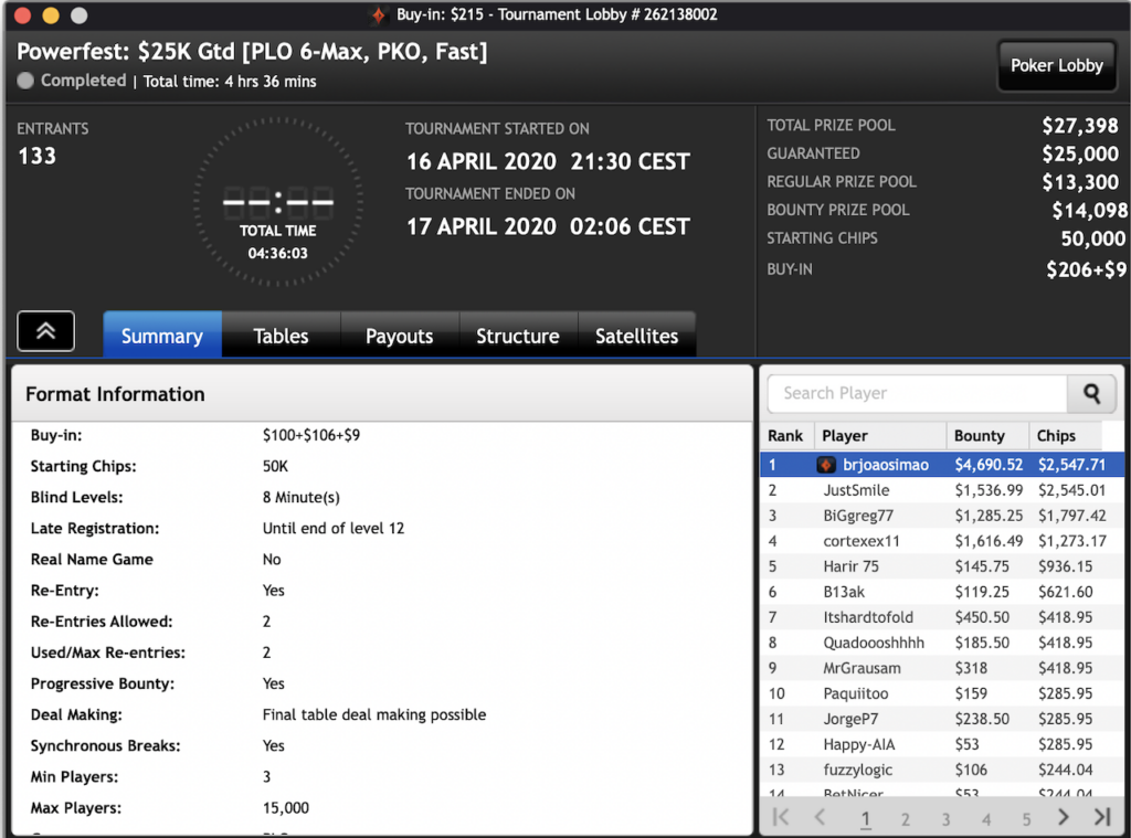 Auch der Brasilianer João Simão wollte da nicht zurückstehen und nahm das $215 PLO 6-max PKO ins Visier. Hier machte in Summe 133 Spieler mit und kämpften um $27.398 im Preispool. Simão schnappte sich den Powerfest Event für ein Preisgeld von insgesamt $7.237.