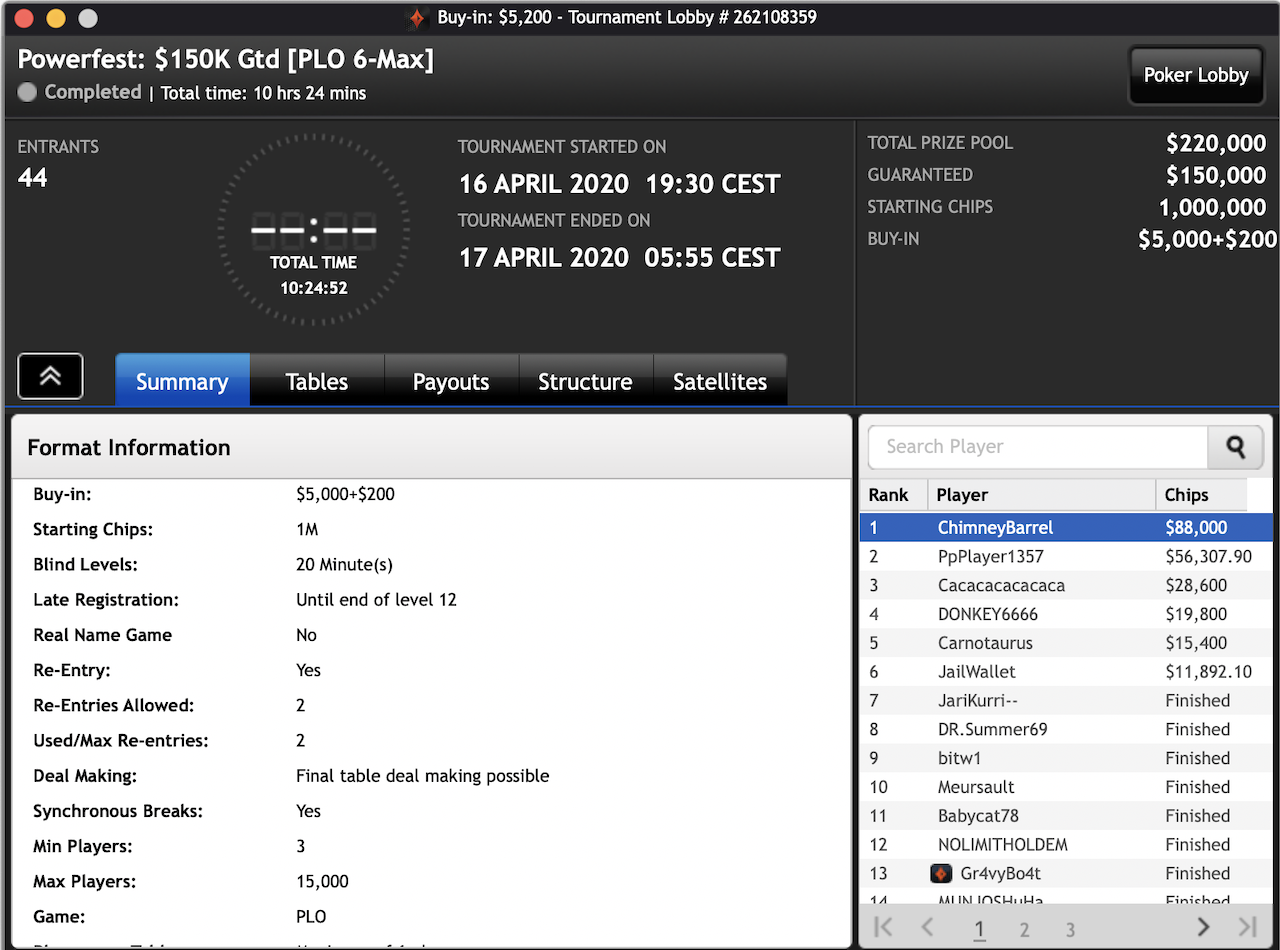 Der Finne Sami „ChimneyBarrel“ Kelopuro schlug beim teuersten Turnier des Tages zu, einem $5.200 PLO 6-max Event. Hier kauften sich 44 Spieler ein, was zu sechs bezahlten Plätzen führte. Kelopuro hatte in jedem Fall das beste Ende für sich und erhält ein Preisgeld von glatten $88.000.