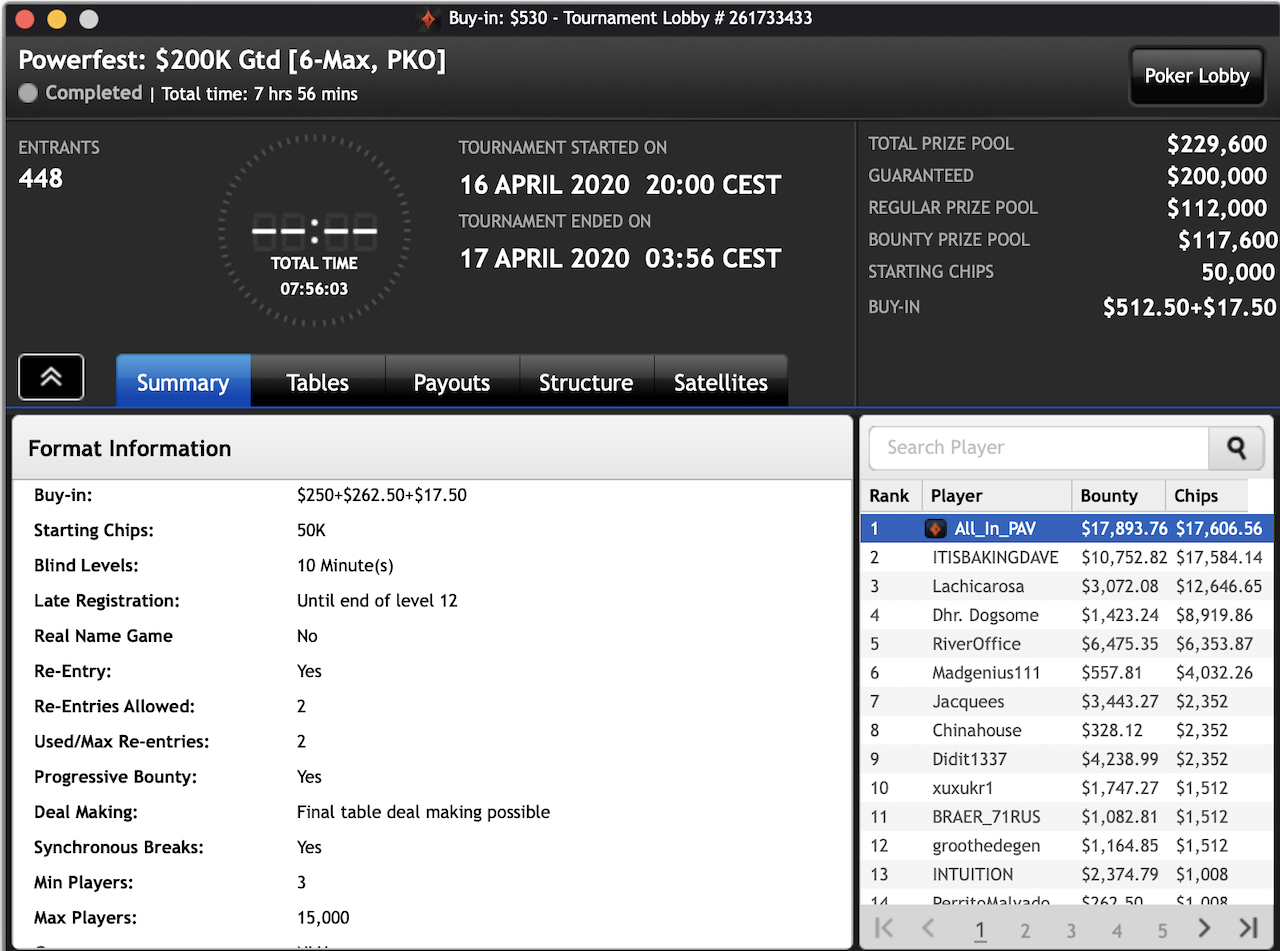 Beim $530 6-max Progressive KnockOut (PKO) setzte sich der australische Team Online Pro Hristivoje „ALLinPav“ Pavlovic gegen 447 Gegner durch. Knapp acht Stunden brauchte er dafür, dann hatte er den Event für sich entschieden und frische $35.499 in seinem Account.