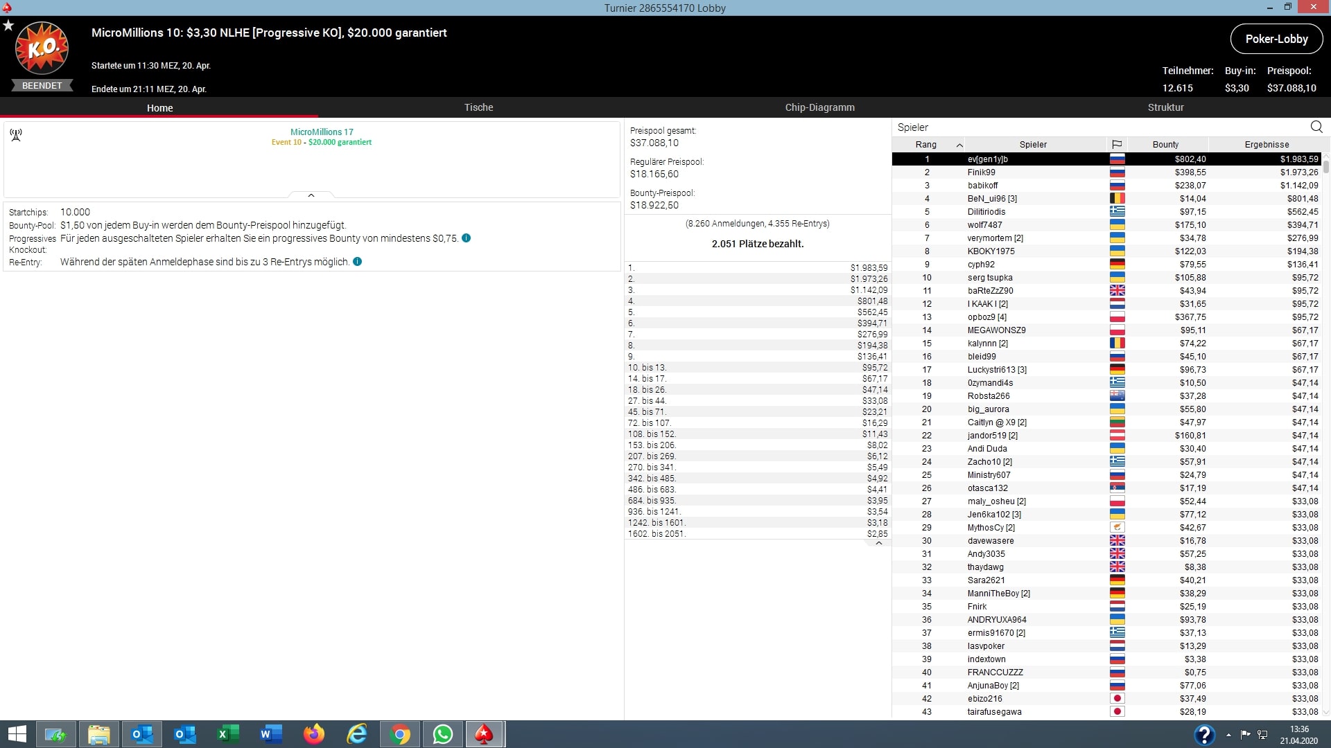 | Mi, 22. Apr | 03:30 | 35 | NLHE 8-Max, PKO | $5,50 | $15K |