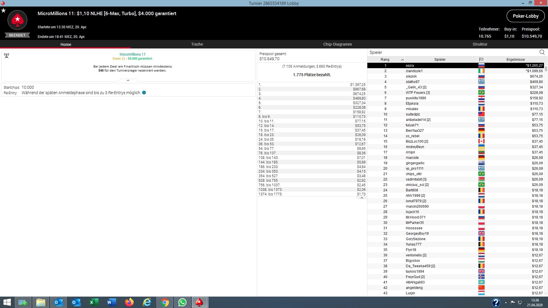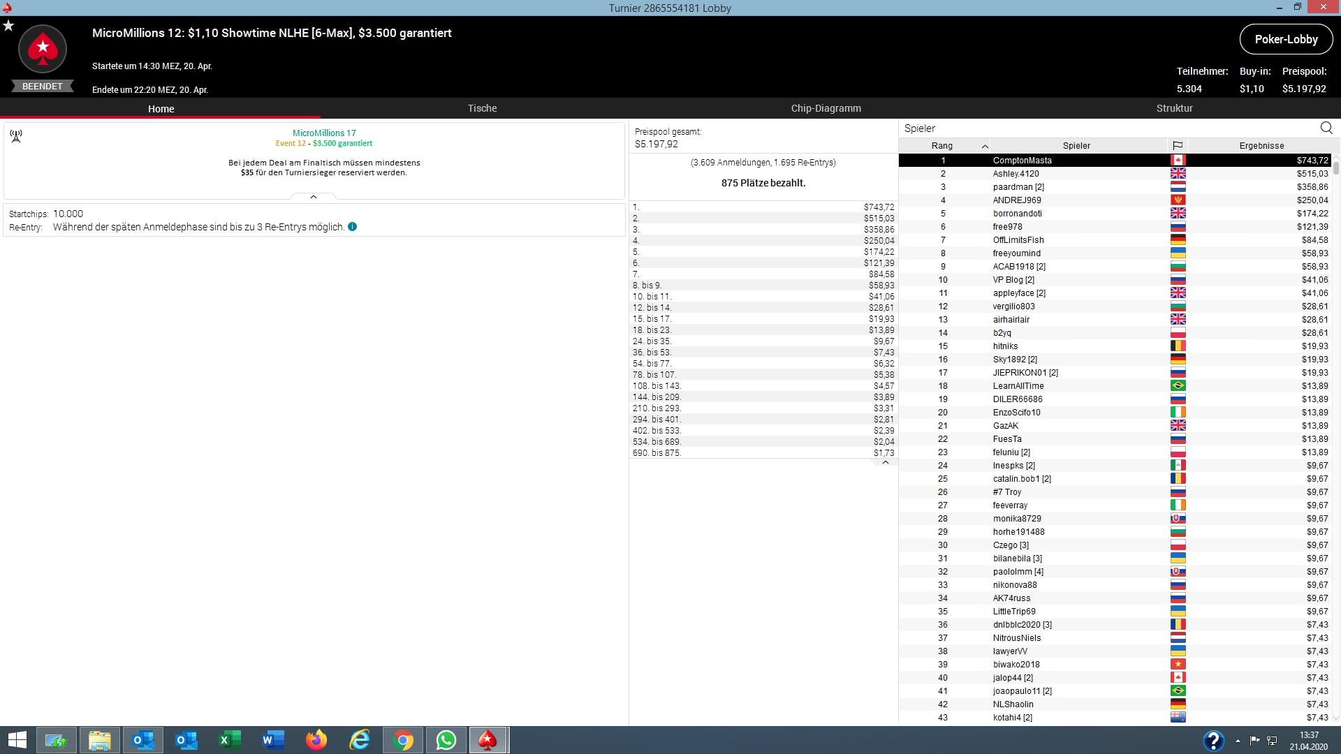 | Fr, 24. Apr | 17:30 | 67 | NLHE 8-Max, Hyper-Turbo | $1,10 | $5K |