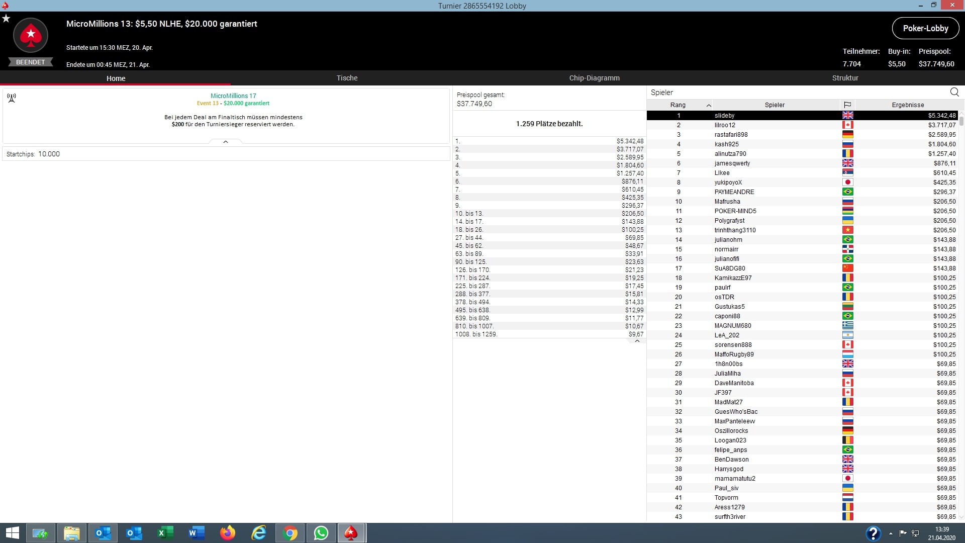 | Mi, 22. Apr | 17:30 | 41 | NLHE | $5,50 | $25K |