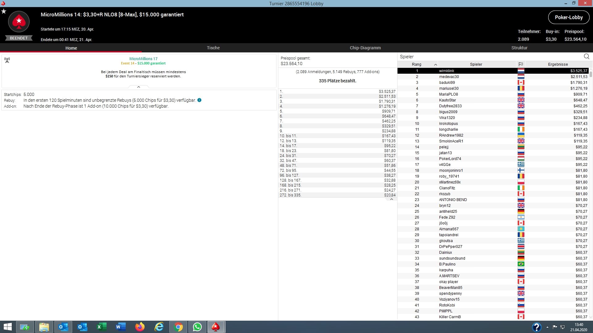 | Di, 21. Apr | 15:30 | 26 | NLHE | $3,30+R | $35K |